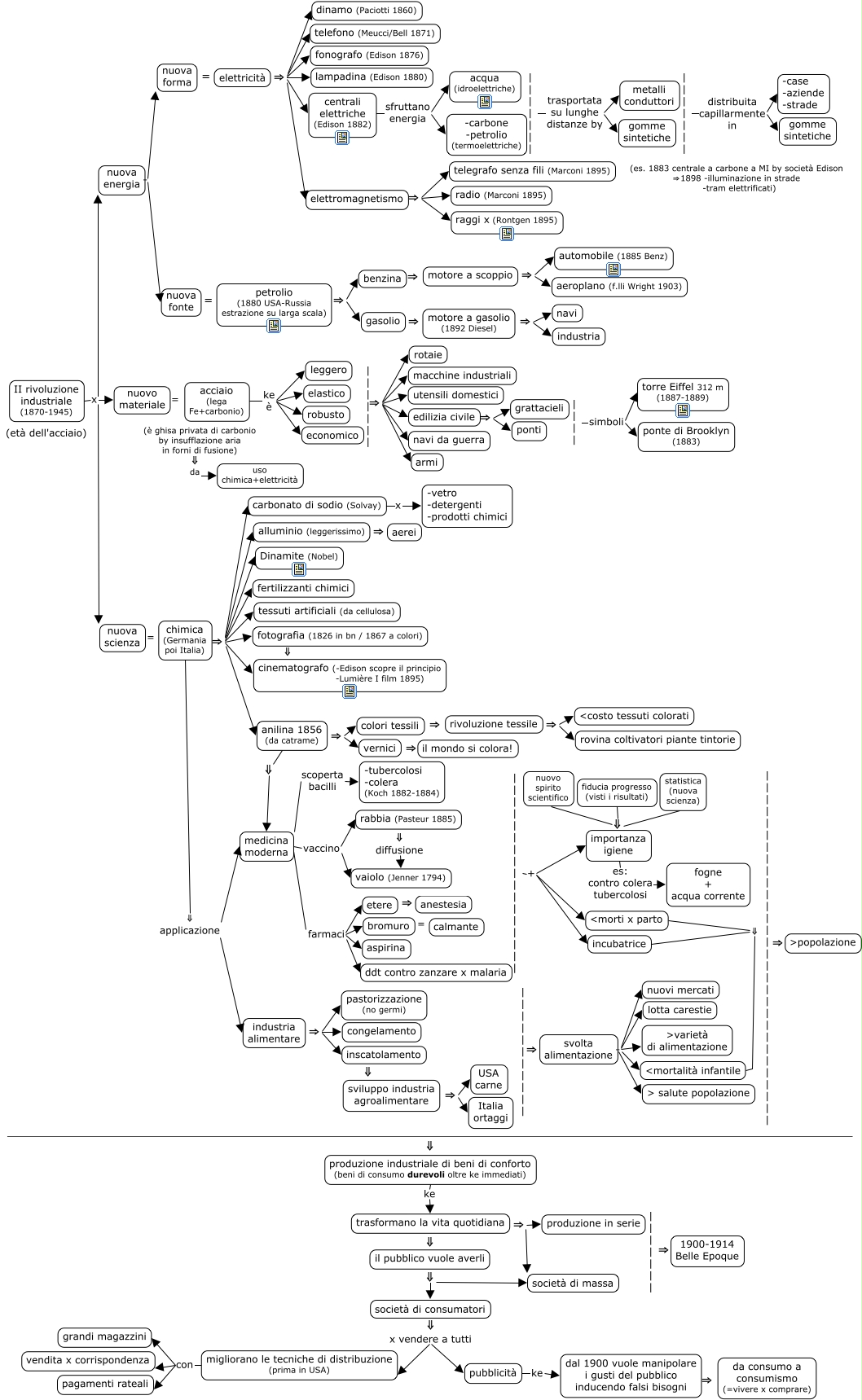 This Concept Map, created with IHMC CmapTools, has information related to: 00_2_riv_ind, nuova scienza = chimica (Germania poi Italia), chimica (Germania poi Italia) ⇒ cinematografo (-Edison scopre il principio -Lumière I film 1895), nuovo spirito scientifico ⇓ importanza igiene, nuova forma = elettricità, II rivoluzione industriale (1870-1945) x nuovo materiale, acciaio (lega Fe+carbonio) ke è robusto, chimica (Germania poi Italia) ⇒ anilina 1856 (da catrame), petrolio (1880 USA-Russia estrazione su larga scala) ⇒ benzina, anilina 1856 (da catrame) ⇓ medicina moderna, società di consumatori ⇓ x vendere a tutti pubblicità, medicina moderna farmaci aspirina, medicina moderna farmaci bromuro, (è ghisa privata di carbonio by insufflazione aria in forni di fusione) ⇓ da uso chimica+elettricità, | | | | | | | trasportata su lunghe distanze by metalli conduttori, elettricità ⇒ fonografo (Edison 1876), II rivoluzione industriale (1870-1945) x nuova energia, nuova energia . nuova forma, elettromagnetismo ⇒ raggi x (Rontgen 1895), | | | | | | | ⇒ 1900-1914 Belle Epoque, pubblicità ke dal 1900 vuole manipolare i gusti del pubblico inducendo falsi bisogni