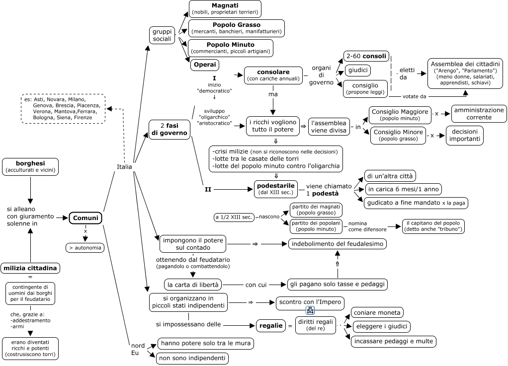 Questa Cmap, creata con IHMC CmapTools, contiene informazioni relative a: 04_comuni, consolare (con cariche annuali) ma i ricchi vogliono tutto il potere, l'assemblea viene divisa in Consiglio Minore (popolo grasso), consolare (con cariche annuali) organi di governo giudici, i ricchi vogliono tutto il potere ⇒ l'assemblea viene divisa, gruppi sociali . Popolo Minuto (commercianti, piccoli artigiani), impongono il potere sul contado ⇒ indebolimento del feudalesimo, la carta di libertà con cui gli pagano solo tasse e pedaggi, partito dei popolani (popolo minuto) nomina come difensore il capitano del popolo (detto anche "tribuno"), a 1/2 XIII sec. nascono partito dei popolani (popolo minuto), gruppi sociali . Popolo Grasso (mercanti, banchieri, manifatturieri), | | | | | eletti da Assemblea dei cittadini ("Arengo", "Parlamento") (meno donne, salariati, apprendisti, schiavi), milizia cittadina si alleano con giuramento solenne in Comuni, borghesi (acculturati e vicini) si alleano con giuramento solenne in Comuni, Comuni Italia si organizzano in piccoli stati indipendenti, Comuni Italia es: Asti, Novara, Milano, Genova, Brescia, Piacenza, Verona, Mantova,Ferrara, Bologna, Siena, Firenze, podestarile (dal XIII sec.) viene chiamato 1 podestà gudicato a fine mandato x la paga, consolare (con cariche annuali) organi di governo consiglio (propone leggi), diritti regali (del re) . incassare pedaggi e multe, Consiglio Maggiore (popolo minuto) x amministrazione corrente, consiglio (propone leggi) votate da Assemblea dei cittadini ("Arengo", "Parlamento") (meno donne, salariati, apprendisti, schiavi)