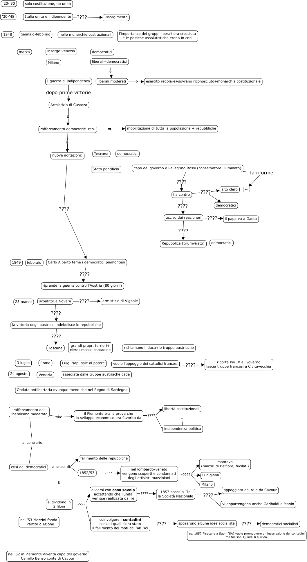 This Concept Map, created with IHMC CmapTools, has information related to: 48_49_italia, nel lombardo-veneto vengono scoperti e condannati degli attivisti mazziniani ???? Milano, rafforzamento del liberalismo moderato xkè il Piemonte era la prova che lo sviluppo economico era favorito da, nel lombardo-veneto vengono scoperti e condannati degli attivisti mazziniani ???? Lunigiana, sconfitto a Novara ???? armistizio di Vignale, 1857 nasce a To la Società Nazionale ???? vi appartengono anche Garibaldi e Manin, il Piemonte era la prova che lo sviluppo economico era favorito da ???? indipendenza politica, Italia unita e indipendente ???? Risorgimento, ha contro ???? alto clero, si dividono in 2 filoni ???? allearsi con casa savoia accettando che l'unità venisse realizzata dal re, crisi dei democratici a causa di fallimento delle repubbiche, crisi dei democratici a causa di 1852/53, libertà costituzionali + indipendenza politica, il Piemonte era la prova che lo sviluppo economico era favorito da ???? libertà costituzionali, ucciso dai reazionari ???? il papa va a Gaeta, capo del governo è Pellegrino Rossi (conservatore illuminato) fa riforme ⇐, sconfitto a Novara ???? la vittoria degli austriaci indebolisce le repubbliche, liberali+democratici ⇓ liberali moderati, liberali moderati ⇒ esercito regolare+sovrano riconosciuto+monarchia costituzionale, allearsi con casa savoia accettando che l'unità venisse realizzata dal re ???? 1857 nasce a To la Società Nazionale, si dividono in 2 filoni ???? coinvolgere i contadini senza i quali c'era stato il fallimento dei moti del '48-'49