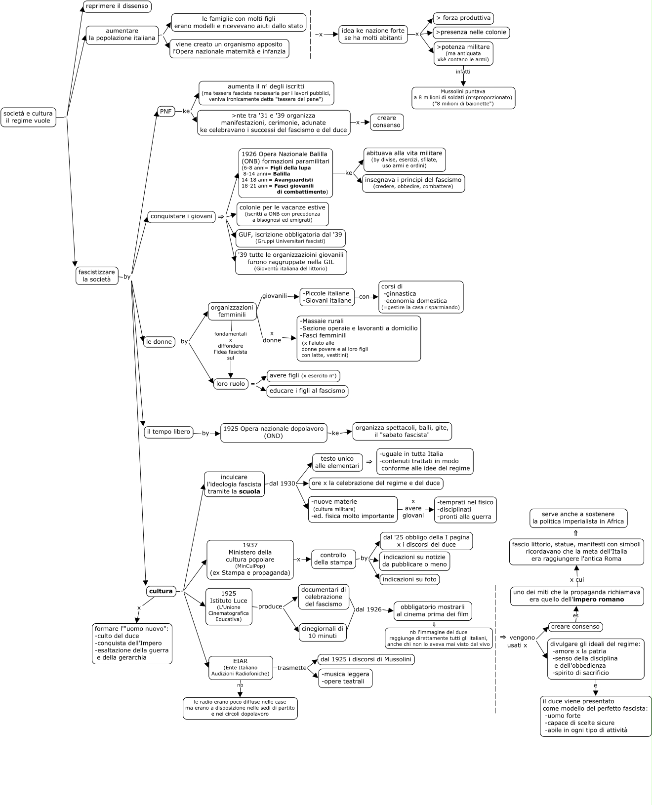 This Concept Map, created with IHMC CmapTools, has information related to: 11_fascismo_5_società_cultura, creare consenso es uno dei miti che la propaganda richiamava era quello dell'impero romano, aumentare la popolazione italiana . le famiglie con molti figli erano modelli e ricevevano aiuti dallo stato, divulgare gli ideali del regime: -amore x la patria -senso della disciplina e dell'obbedienza -spirito di sacrificio e il duce viene presentato come modello del perfetto fascista: -uomo forte -capace di scelte sicure -abile in ogni tipo di attività, EIAR (Ente Italiano Audizioni Radiofoniche) nb le radio erano poco diffuse nelle case ma erano a disposizione nelle sedi di partito e nei circoli dopolavoro, cultura . EIAR (Ente Italiano Audizioni Radiofoniche), PNF ke >nte tra '31 e '39 organizza manifestazioni, cerimonie, adunate ke celebravano i successi del fascismo e del duce, PNF ke aumenta il n° degli iscritti (ma tessera fascista necessaria per i lavori pubblici, veniva ironicamente detta "tessera del pane"), documentari di celebrazione del fascismo dal 1926 obbligatorio mostrarli al cinema prima dei film, 1925 Istituto Luce (L'Unione Cinematografica Educativa) produce documentari di celebrazione del fascismo, controllo della stampa by indicazioni su foto, controllo della stampa by indicazioni su notizie da pubblicare o meno, controllo della stampa by dal '25 obbligo della I pagina x i discorsi del duce, cultura . 1937 Ministero della cultura popolare (MinCulPop) (ex Stampa e propaganda), inculcare l'ideologia fascista tramite la scuola dal 1930 -nuove materie (cultura militare) -ed. fisica molto importante, cultura . inculcare l'ideologia fascista tramite la scuola, fascistizzare la società by cultura, 1925 Opera nazionale dopolavoro (OND) ke organizza spettacoli, balli, gite, il "sabato fascista", fascistizzare la società by il tempo libero, loro ruolo = avere figli (x esercito n°), le donne by loro ruolo