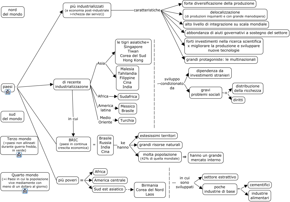 This Concept Map, created with IHMC CmapTools, has information related to: 2b0_paesi, di recente industrializzazone Asia le tigri asiatiche= Singapore Tiwan Corea del Sud Hong Kong, paesi - BRIC (paesi in continua crescita economica), di recente industrializzazone Asia Malesia Tahilandia Filippine Cina India, gravi problemi sociali x diritti, più industrializzati (a economia post-industriale >richezza dai servizi)) caratteristiche forti investimenti nella ricerca scientifica x migliorare la produzione e sviluppare nuove tecnologie, più industrializzati (a economia post-industriale >richezza dai servizi)) caratteristiche abbondanza di aiuti governativi a sostegno del settore, | | | | | | | in cui sono sviluppati settore estrattivo, Sud est asiatico . Birmania Corea del Nord Laos, più industrializzati (a economia post-industriale >richezza dai servizi)) caratteristiche grandi protagoniste: le multinazionali, | | | | | | | in cui sono sviluppati poche industrie di base, di recente industrializzazone Medio Oriente Turchia, più industrializzati (a economia post-industriale >richezza dai servizi)) caratteristiche alto livello di integrazione su scala mondiale, più industrializzati (a economia post-industriale >richezza dai servizi)) caratteristiche delocalizzazione (di produzioni inquinanti e con grande manodopera), Brasile Russia India Cina ke hanno molta popolazione (42% di quella mondiale), di recente industrializzazone America latina Messico Brasile, | | | | | | | | | | | | | | | | | | | | sviluppo condizionato da gravi problemi sociali, | | | | | | | | | | | | | | | | | | | | sviluppo condizionato da dipendenza da investimenti stranieri, più poveri = Africa, BRIC (paesi in continua crescita economica) = Brasile Russia India Cina, di recente industrializzazone Africa Sudafrica