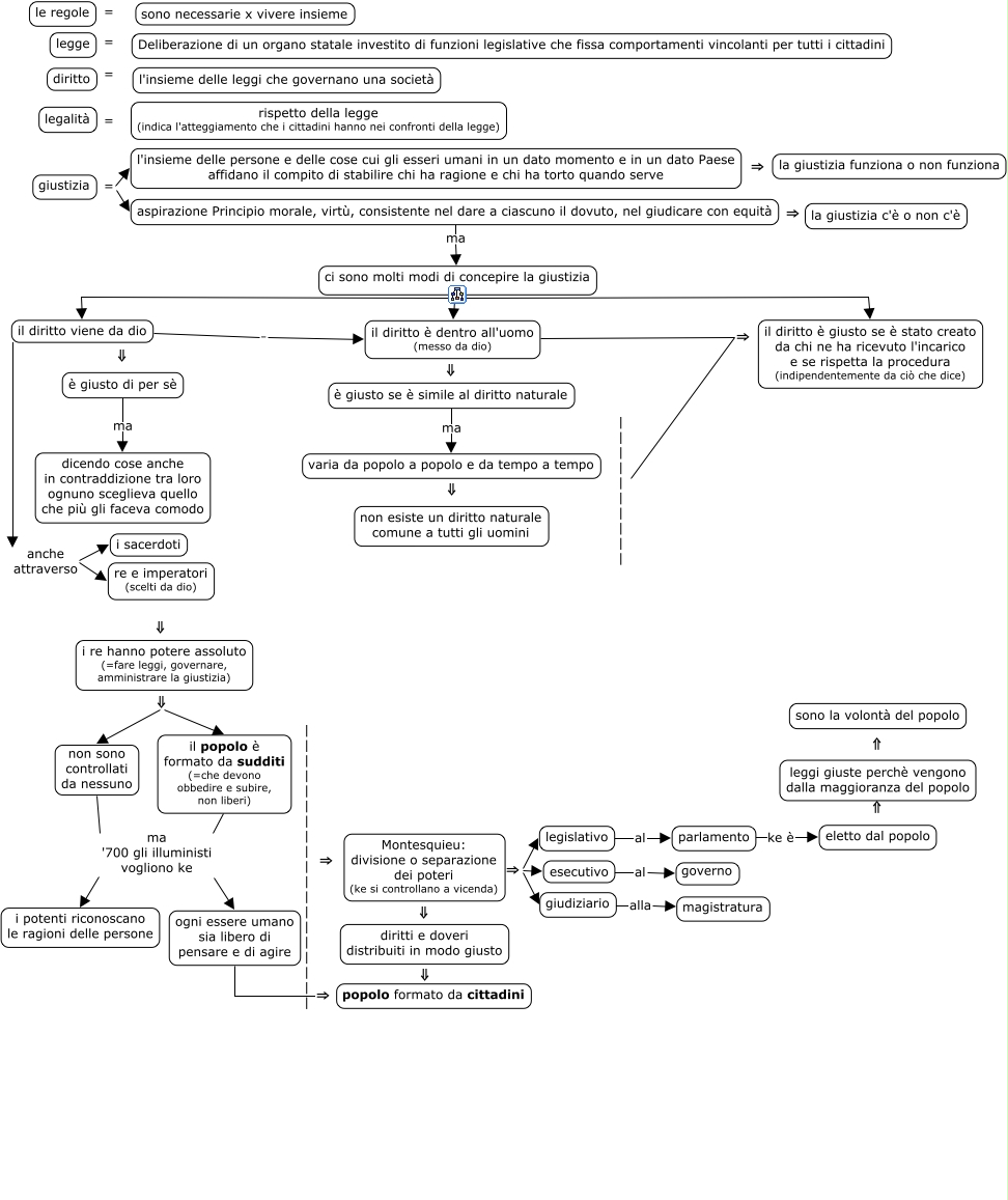 This Concept Map, created with IHMC CmapTools, has information related to: 1_concetti_generali, legge = Deliberazione di un organo statale investito di funzioni legislative che fissa comportamenti vincolanti per tutti i cittadini, diritti e doveri distribuiti in modo giusto ⇓ popolo formato da cittadini, parlamento ke è eletto dal popolo, leggi giuste perchè vengono dalla maggioranza del popolo ⇑ sono la volontà del popolo, il diritto è dentro all'uomo (messo da dio) ⇓ è giusto se è simile al diritto naturale, esecutivo al governo, ci sono molti modi di concepire la giustizia = il diritto è giusto se è stato creato da chi ne ha ricevuto l'incarico e se rispetta la procedura (indipendentemente da ciò che dice), Montesquieu: divisione o separazione dei poteri (ke si controllano a vicenda) ⇒ giudiziario, Montesquieu: divisione o separazione dei poteri (ke si controllano a vicenda) ⇓ diritti e doveri distribuiti in modo giusto, eletto dal popolo ⇑ leggi giuste perchè vengono dalla maggioranza del popolo, è giusto se è simile al diritto naturale ma varia da popolo a popolo e da tempo a tempo, le regole = sono necessarie x vivere insieme, varia da popolo a popolo e da tempo a tempo ⇓ non esiste un diritto naturale comune a tutti gli uomini, il diritto è dentro all'uomo (messo da dio) ⇒ il diritto è giusto se è stato creato da chi ne ha ricevuto l'incarico e se rispetta la procedura (indipendentemente da ciò che dice), il diritto viene da dio . il diritto è dentro all'uomo (messo da dio), il diritto viene da dio anche attraverso re e imperatori (scelti da dio), l'insieme delle persone e delle cose cui gli esseri umani in un dato momento e in un dato Paese affidano il compito di stabilire chi ha ragione e chi ha torto quando serve ⇒ la giustizia funziona o non funziona, i re hanno potere assoluto (=fare leggi, governare, amministrare la giustizia) ⇓ non sono controllati da nessuno, ci sono molti modi di concepire la giustizia = il diritto è dentro all'uomo (messo da dio), ci sono molti modi di concepire la giustizia = il diritto viene da dio