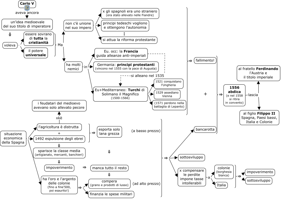 This Concept Map, created with IHMC CmapTools, has information related to: 03_carloV, situazione economica della Spagna . l'agricoltura è distrutta, 1556 abdica (e nel 1558 si ritira in convento) lascia al fratello Ferdinando l'Austria e il titolo imperiale, <math xmlns="http://www.w3.org/1998/Math/MathML"> <mrow> <mfenced open="" close="}"> <mtext>