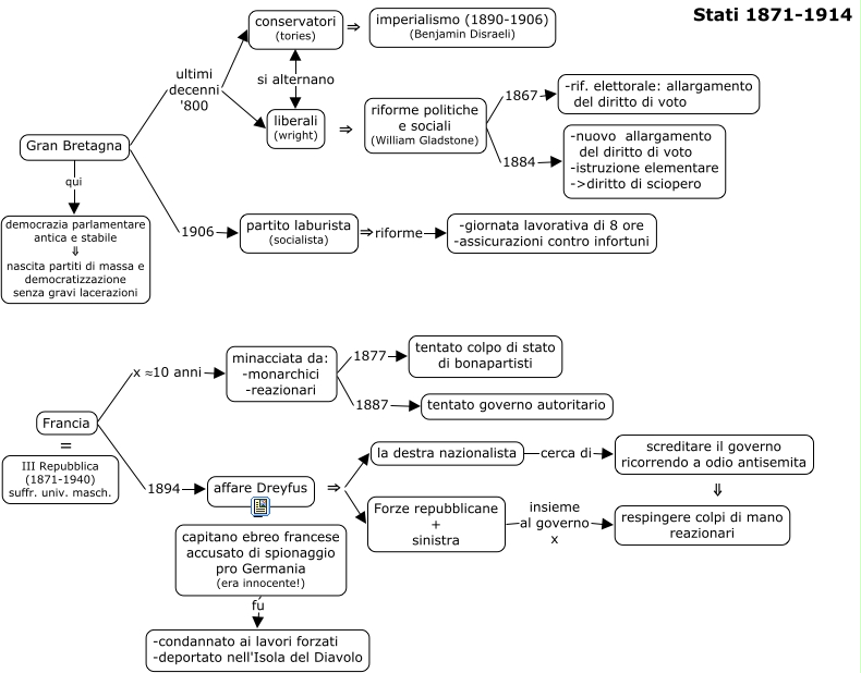 This Concept Map, created with IHMC CmapTools, has information related to: 05a_gb_fr, capitano ebreo francese accusato di spionaggio pro Germania (era innocente!) fu -condannato ai lavori forzati -deportato nell'Isola del Diavolo, screditare il governo ricorrendo a odio antisemita ⇓ respingere colpi di mano reazionari, riforme politiche e sociali (William Gladstone) 1884 -nuovo allargamento del diritto di voto -istruzione elementare ->diritto di sciopero, affare Dreyfus ⇒ la destra nazionalista, liberali (wright) ⇒ riforme politiche e sociali (William Gladstone), Gran Bretagna ultimi decenni '800 liberali (wright), Francia = III Repubblica (1871-1940) suffr. univ. masch., la destra nazionalista cerca di screditare il governo ricorrendo a odio antisemita, partito laburista (socialista) ⇒riforme -giornata lavorativa di 8 ore -assicurazioni contro infortuni, Gran Bretagna 1906 partito laburista (socialista), affare Dreyfus ⇒ Forze repubblicane + sinistra, Forze repubblicane + sinistra insieme al governo x respingere colpi di mano reazionari, minacciata da: -monarchici -reazionari 1877 tentato colpo di stato di bonapartisti, riforme politiche e sociali (William Gladstone) 1867 -rif. elettorale: allargamento del diritto di voto, Gran Bretagna ultimi decenni '800 conservatori (tories), conservatori (tories) ⇒ imperialismo (1890-1906) (Benjamin Disraeli), Gran Bretagna qui democrazia parlamentare antica e stabile ⇓ nascita partiti di massa e democratizzazione senza gravi lacerazioni, minacciata da: -monarchici -reazionari 1887 tentato governo autoritario, Francia x ≈10 anni minacciata da: -monarchici -reazionari, Francia 1894 affare Dreyfus