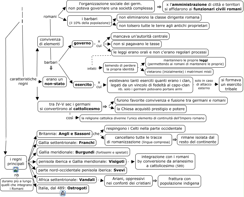 Questa Cmap, creata con IHMC CmapTools, contiene informazioni relative a: 02_regni romano-barbarici_b, l'organizzazione sociale dei germ. non poteva governare una società complessa ⇒ x l'amministrazione di città e territori si affidarono ai funzionari civili romani, | caratteristiche regni erano un non-stato, i regni principali . Italia, dal 489: Ostrogoti, convivenza di elementi barbari governo, | . i regni principali, Britannia: Angli e Sassoni che cancellano tutte le tracce di romanizzazione (lingua compresa), i regni principali . Britannia: Angli e Sassoni, tra IV-V sec i germani si convertirono al cattolicesmo ⇒ furono favorite convivenza e fusione tra germani e romani, i regni principali . parte nord-occidentale penisola iberica: Svevi, convivenza di elementi romani i barbari (il 10% della popolazione), convivenza di elementi romani l'organizzazione sociale dei germ. non poteva governare una società complessa, governo x cui le leggi erano orali e non c'erano regolari processi, temendo di perdere la propria identità - mantennero le proprie leggi (permettendo ai romani di mantenere le proprie), i regni principali nb durano più a lungo quelli che integrano i Romani, i barbari (il 10% della popolazione) . non eliminarono la classe dirigente romana, Britannia: Angli e Sassoni che respingono i Celti nella parte occidentale, esercito x cui esistevano tanti eserciti quanti erano i clan, legati da un vincolo di fedeltà al capo-clan nb. solo i germani potevano portare armi, | caratteristiche regni tra IV-V sec i germani si convertirono al cattolicesmo, | caratteristiche regni convivenza di elementi, governo x cui non si pagavano le tasse