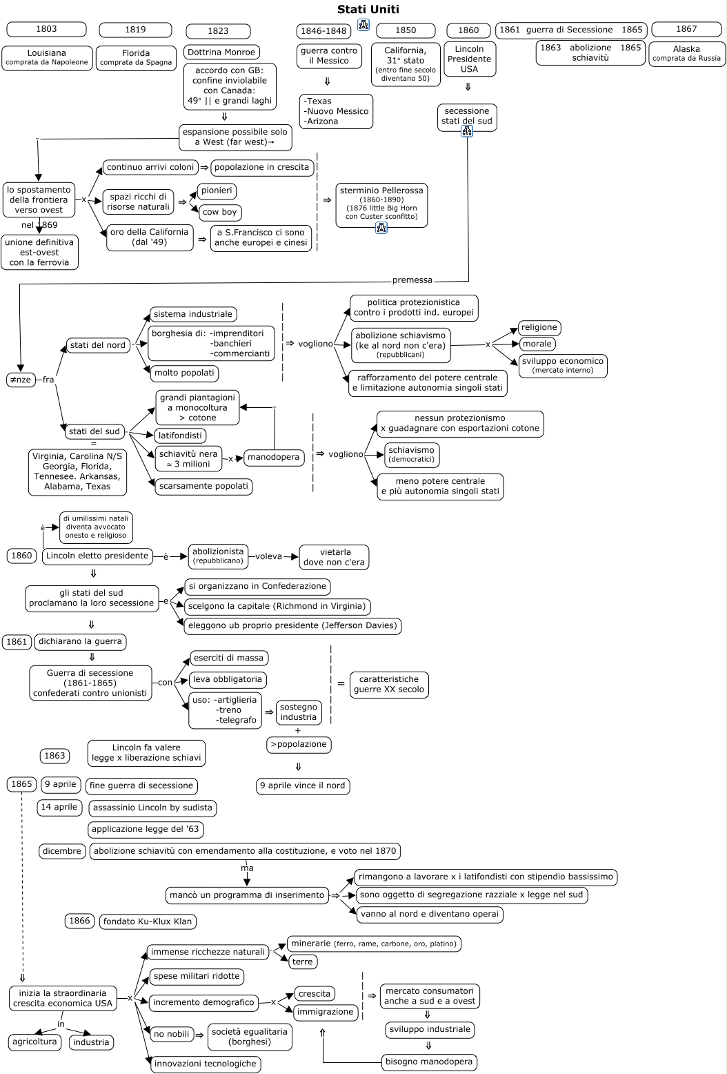 This Concept Map, created with IHMC CmapTools, has information related to: 00a_usa, stati del sud . scarsamente popolati, | | | | | | | | ⇒ vogliono abolizione schiavismo (ke al nord non c'era) (repubblicani), | | | | | | | | ⇒ vogliono schiavismo (democratici), espansione possibile solo a West (far west)→ . lo spostamento della frontiera verso ovest, Lincoln eletto presidente è abolizionista (repubblicano), guerra contro il Messico ⇓ -Texas -Nuovo Messico -Arizona, oro della California (dal '49) ⇒ a S.Francisco ci sono anche europei e cinesi, continuo arrivi coloni ⇒ popolazione in crescita, schiavitù nera ≈ 3 milioni x manodopera, Lincoln eletto presidente ⇓ gli stati del sud proclamano la loro secessione, Lincoln Presidente USA ⇓ secessione stati del sud, stati del sud . latifondisti, inizia la straordinaria crescita economica USA x innovazioni tecnologiche, uso: -artiglieria -treno -telegrafo ⇒ sostegno industria, lo spostamento della frontiera verso ovest x continuo arrivi coloni, ≠nze fra stati del sud, sviluppo industriale ⇓ bisogno manodopera, abolizionista (repubblicano) voleva vietarla dove non c'era, inizia la straordinaria crescita economica USA in industria, abolizione schiavismo (ke al nord non c'era) (repubblicani) x sviluppo economico (mercato interno)