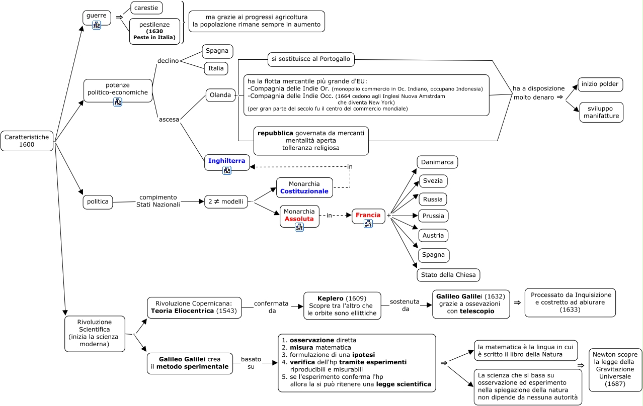 </mtext> </mfenced> </mrow> </math> ma grazie ai progressi agricoltura la popolazione rimane sempre in aumento, 1. osservazione diretta 2. misura matematica 3. formulazione di una ipotesi 4. verifica dell'hp tramite esperimenti riproducibili e misurabili 5. se l'esperimento conferma l'hp allora la si può ritenere una legge scientifica ⇒ La scienza che si basa su osservazione ed esperimento nella spiegazione della natura non dipende da nessuna autorità, la matematica è la lingua in cui è scritto il libro della Natura ⇒, Caratteristiche 1600 . Rivoluzione Scientifica (inizia la scienza moderna), Caratteristiche 1600 . potenze politico-economiche, Monarchia Assoluta in Francia, ha la flotta mercantile più grande d'EU: -Compagnia delle Indie Or. (monopolio commercio in Oc. Indiano, occupano Indonesia) -Compagnia delle Indie Occ. (1664 cedono agli Inglesi Nuova Amstrdam che diventa New York) (per gran parte del secolo fu il centro del commercio mondiale) ha a disposizione molto denaro ⇒ sviluppo manifatture, Keplero (1609) Scopre tra l'altro che le orbite sono ellittiche sostenuta da Galileo Galilei (1632) grazie a ossevazioni con telescopio, Francia + Austria, Francia + Svezia, si sostituisce al Portogallo ha a disposizione molto denaro ⇒ sviluppo manifatture, Francia + Russia, potenze politico-economiche ascesa Inghilterra, Francia + Prussia, Francia + Danimarca, 2 ≠ modelli - Monarchia Costituzionale, potenze politico-economiche ascesa Olanda, Caratteristiche 1600 . politica