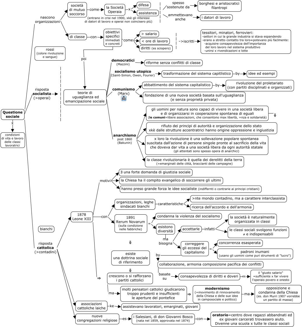 This Concept Map, created with IHMC CmapTools, has information related to: 04_questione sociale, Questione sociale risposta cattolica (>contadini) 1878 Leone XIII, accettarle infatti le classi sociali svolgono funzioni ≠ e indispensabili, correggere gli eccessi del capitalismo = padroni inumani (usano gli uomini come puri strumenti di "lucro"), teorie di uguaglianza ed emancipazione sociale socialismo utopico (Saint-Simon, Owen, Fourier) trasformazione del sistema capitlistico, nuove congregazioni religiose es i Salesiani, di don Giovanni Bosco (nata nel 1859, approvata nel 1874), associazioni cattoliche laiche ke assistevano lavoratori, emarginati, giovani, Questione sociale x condizioni di vita e lavoro delle classi lavoratrici, 1878 Leone XIII con 1891 Rerum Novarum (sulla condizione nelle fabbriche), | | | | | spesso sostenute da borghesi e aristocratici filantropi, obiettivi specifici immediati e concreti come < ore di lavoro, teorie di uguaglianza ed emancipazione sociale anarchismo post 1860 (Bakunin) x loro la rivoluzione è una sollevazione popolare spontanea suscitata dall'azione di persone singole pronte al sacrificio della vita che doveva dar vita a una società libera da ogni autorità statale (gli attentati sono spesso opera di anarchici), molti pensatori cattolici giudicarono troppo prudenti e insufficienti le aperture del pontefice ⇒ modernismo (=movimento di rinnovamento della Chiesa e delle sue idee in camposociale e politico), esistono diversità ma bisogna correggere gli eccessi del capitalismo, di classe con obiettivi specifici immediati e concreti, gli uomini per natura sono capaci di vivere in una società libera e di organizzarsi in cooperazione spontanea di eguali (le comuni=libere associazioni, che consentono max libertà, =nza e solidarietà) ⇓ rifiuto dei principi di autorità e organizzazione dello stato xkè dalle strutture accentratrici hanno origine oppressione e ingiustizia, 1878 Leone XIII motivi la Chiesa ha il compito evangelico di soccorrere gli ultimi, la Società Operaia x assistenza, 1878 Leone XIII motivi ∃ una forte domanda di giustizia sociale, Questione sociale nascono organizzazioni società di mutuo soccorso, 1878 Leone XIII ⇒ crescono o si rafforzano i partiti cattolici