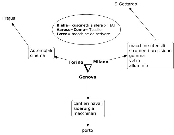 This Concept Map, created with IHMC CmapTools, has information related to: 06a_triangolo industriale, cantieri navali siderurgia macchinari . porto, ∇ Genova cantieri navali siderurgia macchinari, macchine utensili strumenti precisione gomma vetro alluminio . S.Gottardo, ∇ Torino Automobili cinema, Automobili cinema . Frejus, ∇ Milano macchine utensili strumenti precisione gomma vetro alluminio