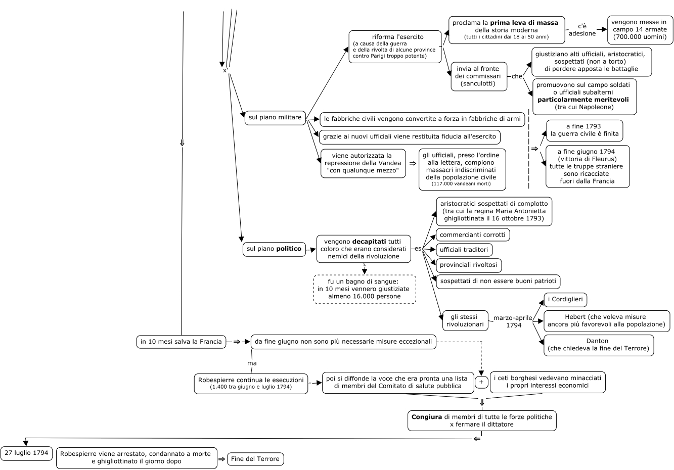 This Concept Map, created with IHMC CmapTools, has information related to: 11 riv francese 4b, sul piano militare . grazie ai nuovi ufficiali viene restituita fiducia all'esercito, instaura una dittatura, che chiama Terrore x' sul piano economico, sul piano politico . vengono decapitati tutti coloro che erano considerati nemici della rivoluzione, gli stessi rivoluzionari marzo-aprile 1794 i Cordiglieri, Congiura di membri di tutte le forze politiche x fermare il dittatore ⇐ 27 luglio 1794, invia al fronte dei commissari (sanculotti) che promuovono sul campo soldati o ufficiali subalterni particolarmente meritevoli (tra cui Napoleone), instaura una dittatura, che chiama Terrore x' sul piano sociale, proclama la prima leva di massa della storia moderna (tutti i cittadini dai 18 ai 50 anni) c'è adesione vengono messe in campo 14 armate (700.000 uomini), riforma l'esercito (a causa della guerra e della rivolta di alcune province contro Parigi troppo potente) . proclama la prima leva di massa della storia moderna (tutti i cittadini dai 18 ai 50 anni), vengono decapitati tutti coloro che erano considerati nemici della rivoluzione es ufficiali traditori, invia al fronte dei commissari (sanculotti) che giustiziano alti ufficiali, aristocratici, sospettati (non a torto) di perdere apposta le battaglie, in 10 mesi salva la Francia ⇒ da fine giugno non sono più necessarie misure eccezionali, <math xmlns="http://www.w3.org/1998/Math/MathML"> <mtext> |