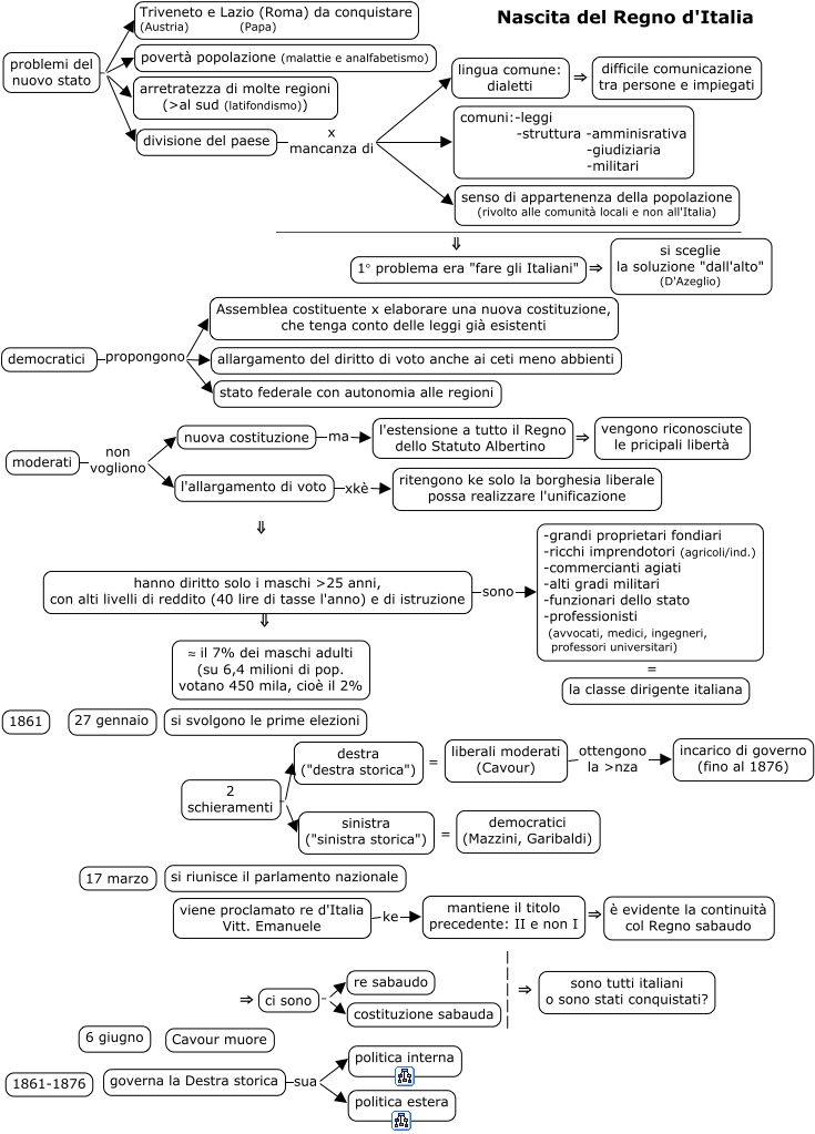 This Concept Map, created with IHMC CmapTools, has information related to: 13_regno_italia, ci sono . re sabaudo, divisione del paese x mancanza di comuni:-leggi -struttura -amminisrativa -giudiziaria -militari, 2 schieramenti . sinistra ("sinistra storica"), problemi del nuovo stato . divisione del paese, ci sono . costituzione sabauda, lingua comune: dialetti ⇒ difficile comunicazione tra persone e impiegati, moderati non vogliono l'allargamento di voto, divisione del paese x mancanza di senso di appartenenza della popolazione (rivolto alle comunità locali e non all'Italia), destra ("destra storica") = liberali moderati (Cavour), divisione del paese x mancanza di lingua comune: dialetti, 1° problema era "fare gli Italiani" ⇒ si sceglie la soluzione "dall'alto" (D'Azeglio), hanno diritto solo i maschi ᡑ anni, con alti livelli di reddito (40 lire di tasse l'anno) e di istruzione sono -grandi proprietari fondiari -ricchi imprendotori (agricoli/ind.) -commercianti agiati -alti gradi militari -funzionari dello stato -professionisti (avvocati, medici, ingegneri, professori universitari), problemi del nuovo stato . Triveneto e Lazio (Roma) da conquistare (Austria) (Papa), -grandi proprietari fondiari -ricchi imprendotori (agricoli/ind.) -commercianti agiati -alti gradi militari -funzionari dello stato -professionisti (avvocati, medici, ingegneri, professori universitari) = la classe dirigente italiana, mantiene il titolo precedente: II e non I ⇒ è evidente la continuità col Regno sabaudo, liberali moderati (Cavour) ottengono la >nza incarico di governo (fino al 1876), hanno diritto solo i maschi ᡑ anni, con alti livelli di reddito (40 lire di tasse l'anno) e di istruzione ⇓ ≈ il 7% dei maschi adulti (su 6,4 milioni di pop. votano 450 mila, cioè il 2%, l'estensione a tutto il Regno dello Statuto Albertino ⇒ vengono riconosciute le pricipali libertà, moderati non vogliono nuova costituzione, democratici propongono allargamento del diritto di voto anche ai ceti meno abbienti