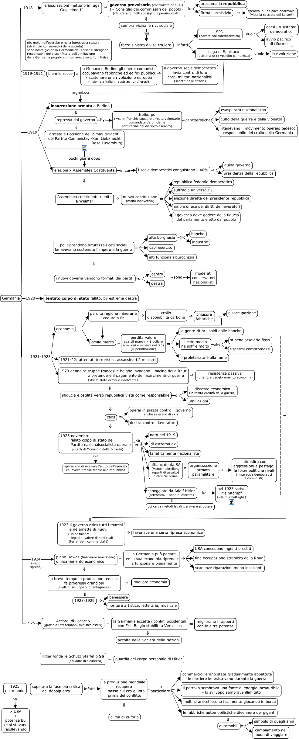 This Concept Map, created with IHMC CmapTools, has information related to: 09b_germania, il ceto medio ne soffre molto xkè stipendio/salario fisso, chiusura fabbriche ⇒ disoccupazione, poi riprendono sicurezza i ceti sociali ke avevano sostenuto l'impero e la guerra ⇓ i nuovi governi vengono formati dai partiti, la produzione mondiale recupera il passo cui era giunta prima del conflitto in particolare molti si arricchiscono facilmente giocando in borsa, 1923-1929 ⇒ fioritura artistica, letteraria, musicale, 1923 novembre fallito colpo di stato del Partito nazionalsocialista operaio (putsch di Monaco o della Birreria) xkè speravano di ricevere l'aiuto dell'esercito ke invece rimase fedele alla repubblica, 1923 novembre fallito colpo di stato del Partito nazionalsocialista operaio (putsch di Monaco o della Birreria) ke era capeggiato da Adolf Hitler (arrestato, 1 anno di carcere), Germania 1921-1923 1921-22: attentati terroristici, assassinati 2 ministri, governo provvisorio (controllato da SPD) (= Consiglio dei commissari del popolo) (nb. c'erano molti consigli di operai/soldati) ke firma l'armistizio, automobili = simbolo di quegli anni, i nuovi governi vengono formati dai partiti di centro, sembra vicina la riv. sociale ma forze sinistra divise tra loro, 1925 nel mondo nb > USA + potenze Eu ke si stavano risollevando, freikorps (=corpi franchi: squadre armate volontarie comandate da ufficiali e sottufficiali del disciolto esercito) caratterstiche culto della guerra e della violenza, i nuovi governi vengono formati dai partiti di destra, piano Dawes (finanziere americano) di risanamento economico = la Germania può pagare ⇔ la sua economia riprende a funzionare pienamente, Assemblea costituente riunita a Weimar ⇒ nuova costituzione (molto innovativa), Accordi di Locarno (grazie a Stresemann, ministro esteri) = la Germania accetta i confini occidentali con Fr e Belgio stabiliti a Versailles, Lega di Spartaco (estrema sx) (=partito comunista) organizza insurrezione armata a Berlino, perdita valore (da 15 marchi x 1 dollaro a milioni e miliardi nel '23) (=iperinflazione) ⇒ il proletariato è alla fame