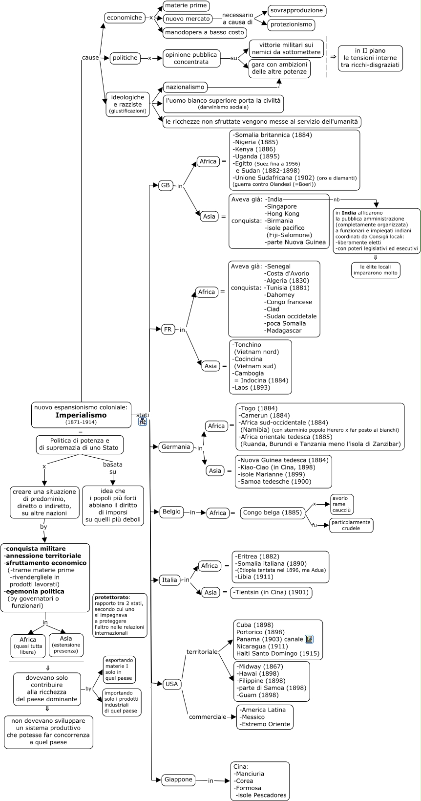 This Concept Map, created with IHMC CmapTools, has information related to: 03_espansione coloniale, nuovo espansionismo coloniale: Imperialismo (1871-1914) stati Belgio, Politica di potenza e di supremazia di uno Stato basata su idea che i popoli più forti abbiano il diritto di imporsi su quelli più deboli, Africa = Congo belga (1885), economiche x materie prime, Congo belga (1885) x avorio rame caucciù, | | | | | | ⇒ in II piano le tensioni interne tra ricchi-disgraziati, FR in Africa, Italia in Asia, nuovo mercato necessario a causa di protezionismo, nazionalismo . gara con ambizioni delle altre potenze, nuovo espansionismo coloniale: Imperialismo (1871-1914) stati Germania, Asia = -Tientsin (in Cina) (1901), GB in Africa, Giappone in Cina: -Manciuria -Corea -Formosa -isole Pescadores, Belgio in Africa, ideologiche e razziste (giustificazioni) . le ricchezze non sfruttate vengono messe al servizio dell'umanità, ???? nb in India affidarono la pubblica amministrazione (completamente organizzata) a funzionari e impiegati indiani coordinati da Consigli locali: -liberamente eletti -con poteri legislativi ed esecutivi, nuovo espansionismo coloniale: Imperialismo (1871-1914) stati USA, nuovo espansionismo coloniale: Imperialismo (1871-1914) cause economiche, dovevano solo contribuire alla ricchezza del paese dominante ⇓ non dovevano sviluppare un sistema produttivo che potesse far concorrenza a quel paese