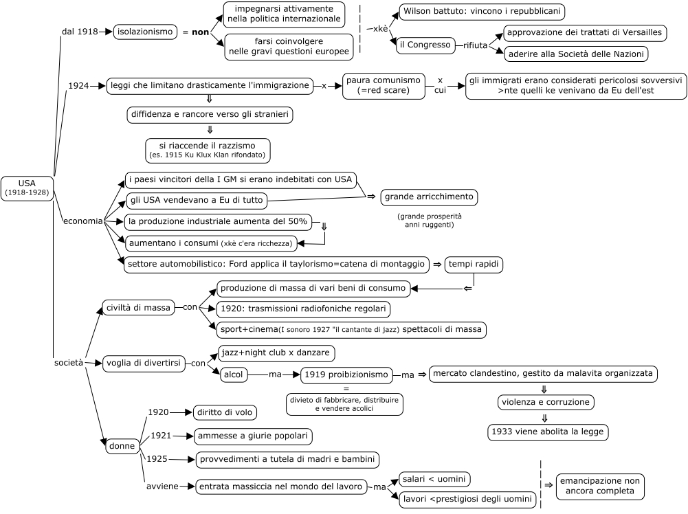 This Concept Map, created with IHMC CmapTools, has information related to: 09c_usa, il Congresso rifiuta approvazione dei trattati di Versailles, leggi che limitano drasticamente l'immigrazione ⇓ diffidenza e rancore verso gli stranieri, civiltà di massa con sport+cinema(I sonoro 1927 "il cantante di jazz) spettacoli di massa, leggi che limitano drasticamente l'immigrazione x paura comunismo (=red scare), 1919 proibizionismo ma ⇒ mercato clandestino, gestito da malavita organizzata, USA (1918-1928) economia settore automobilistico: Ford applica il taylorismo=catena di montaggio, USA (1918-1928) economia i paesi vincitori della I GM si erano indebitati con USA, USA (1918-1928) economia aumentano i consumi (xkè c'era ricchezza), voglia di divertirsi con alcol, violenza e corruzione ⇓ 1933 viene abolita la legge, il Congresso rifiuta aderire alla Società delle Nazioni, | | | | | ⇒ emancipazione non ancora completa, | | | | | xkè Wilson battuto: vincono i repubblicani, civiltà di massa con 1920: trasmissioni radiofoniche regolari, gli USA vendevano a Eu di tutto ⇒ grande arricchimento, USA (1918-1928) società civiltà di massa, mercato clandestino, gestito da malavita organizzata ⇓ violenza e corruzione, civiltà di massa con produzione di massa di vari beni di consumo, donne 1921 ammesse a giurie popolari, voglia di divertirsi con jazz+night club x danzare