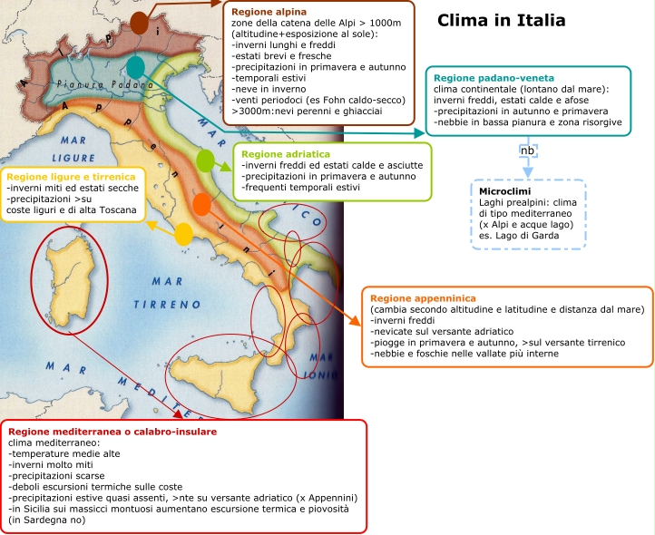 This Concept Map, created with IHMC CmapTools, has information related to: 04_I_clima italia, Regione padano-veneta clima continentale (lontano dal mare): inverni freddi, estati calde e afose -precipitazioni in autunno e primavera -nebbie in bassa pianura e zona risorgive, Regione ligure e tirrenica -inverni miti ed estati secche -precipitazioni >su coste liguri e di alta Toscana, Regione mediterranea o calabro-insulare clima mediterraneo: -temperature medie alte -inverni molto miti -precipitazioni scarse -deboli escursioni termiche sulle coste -precipitazioni estive quasi assenti, >nte su versante adriatico (x Appennini) -in Sicilia sui massicci montuosi aumentano escursione termica e piovosità (in Sardegna no), Regione alpina zone della catena delle Alpi > 1000m (altitudine+esposizione al sole): -inverni lunghi e freddi -estati brevi e fresche -precipitazioni in primavera e autunno -temporali estivi -neve in inverno -venti periodoci (es Fohn caldo-secco) m:nevi perenni e ghiacciai, Regione appenninica (cambia secondo altitudine e latitudine e distanza dal mare) -inverni freddi -nevicate sul versante adriatico -piogge in primavera e autunno, >sul versante tirrenico -nebbie e foschie nelle vallate più interne, Regione adriatica -inverni freddi ed estati calde e asciutte -precipitazioni in primavera e autunno -frequenti temporali estivi, Regione padano-veneta clima continentale (lontano dal mare): inverni freddi, estati calde e afose -precipitazioni in autunno e primavera -nebbie in bassa pianura e zona risorgive nb Microclimi Laghi prealpini: clima di tipo mediterraneo (x Alpi e acque lago) es. Lago di Garda