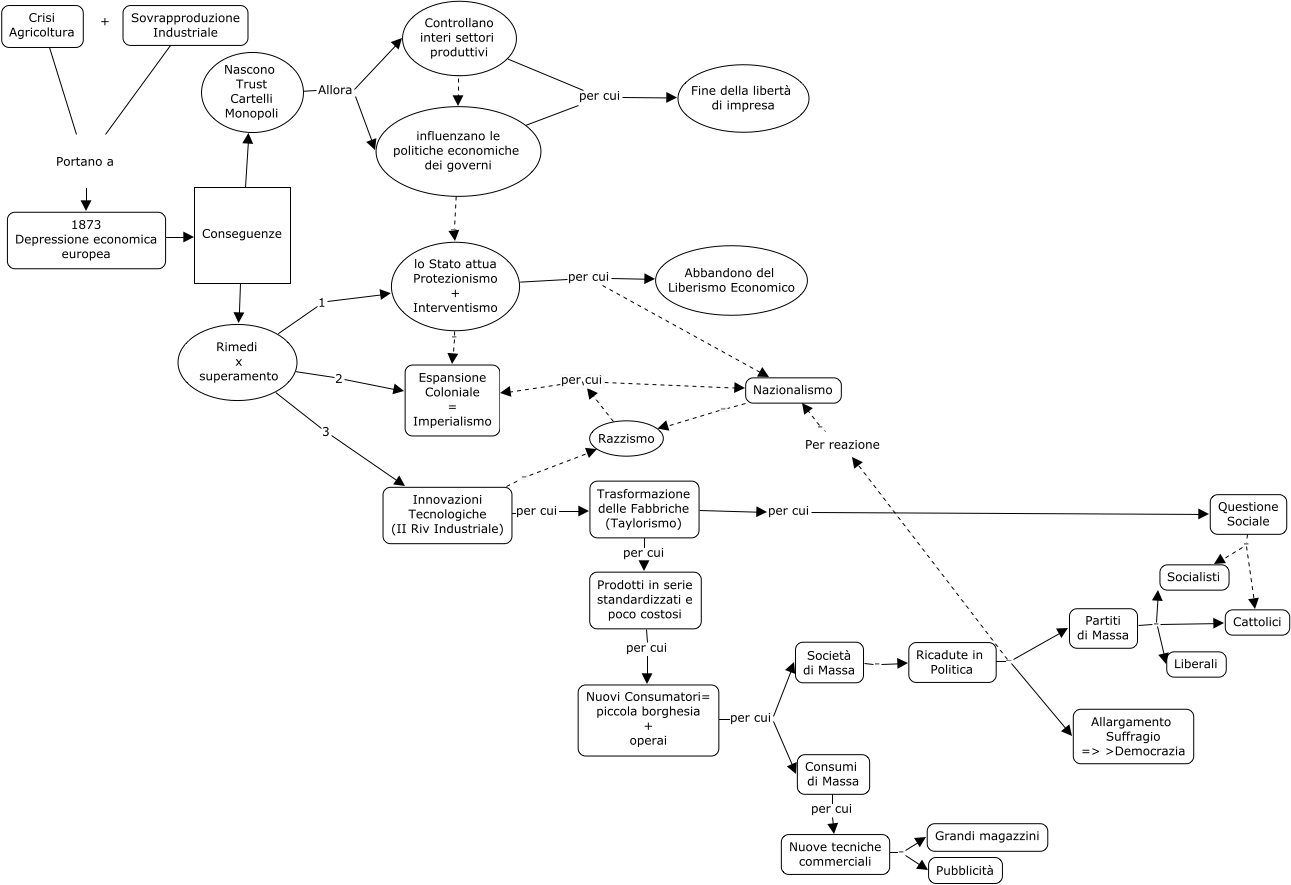 This Concept Map, created with IHMC CmapTools, has information related to: 02a_periodo II riv ind, Innovazioni Tecnologiche (II Riv Industriale) . Razzismo, Sovrapproduzione Industriale Portano a 1873 Depressione economica europea, lo Stato attua Protezionismo + Interventismo per cui Abbandono del Liberismo Economico, Consumi di Massa per cui Nuove tecniche commerciali, Crisi Agricoltura Portano a 1873 Depressione economica europea, Società di Massa . Ricadute in Politica, Rimedi x superamento 1 lo Stato attua Protezionismo + Interventismo, 1873 Depressione economica europea Conseguenze Rimedi x superamento, Ricadute in Politica - Allargamento Suffragio => >Democrazia, Nascono Trust Cartelli Monopoli Allora Controllano interi settori produttivi, Crisi Agricoltura + Sovrapproduzione Industriale, Trasformazione delle Fabbriche (Taylorismo) per cui Prodotti in serie standardizzati e poco costosi, Partiti di Massa . Cattolici, Nuovi Consumatori= piccola borghesia + operai per cui Società di Massa, Nascono Trust Cartelli Monopoli Allora influenzano le politiche economiche dei governi, Ricadute in Politica - Partiti di Massa, Questione Sociale . Socialisti, Controllano interi settori produttivi per cui Fine della libertà di impresa, Ricadute in Politica - Per reazione, Razzismo per cui