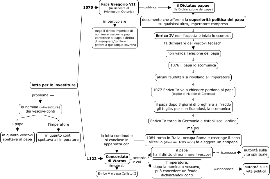 Questa Cmap, creata con IHMC CmapTools, contiene informazioni relative a: 07_lotta _per_le_investiture, la nomina (=investitura) dei vescovi-conti x l'imperatore in quanto conti spettava all'imperatore, lotta per le investiture problema la nomina (=investitura) dei vescovi-conti, Concordato di Worms accordo x cui il papa ha il diritto di nominare i vescovi, documento che afferma la superiorità politica del papa su qualsiasi altra, imperatore compreso in particolare -nega il diritto imperiale di nominare vescovi e papi -conferisce al papa il diritto di assegnare/togliere il potere a qualunque sovrano, documento che afferma la superiorità politica del papa su qualsiasi altra, imperatore compreso ⇓ Enrico IV non l'accetta e inizia lo scontro:, il papa ha il diritto di nominare i vescovi ⇒riconosce autorità sulla vita spirituale, Concordato di Worms accordo x cui l'imperatore, dopo la nomina a vescovo, può concedere un feudo, dichiarandoli conti, 1076 il papa lo scomunica ⇓ alcuni feudatari si ribellano all'imperatore, 1077 Enrico IV va a chiedere perdono al papa (ospite di Matilde di Canossa) ⇓ il papa dopo 3 giorni di preghiera al freddo gli toglie, pur non fidandosi, la scomunica, non valida l'elezione del papa ⇓ 1076 il papa lo scomunica, lotta per le investiture 1075 Papa Gregorio VII (in risposta al Privilegium Othonis), 1084 torna in Italia, occupa Roma e costringe il papa all'esilio (dove nel 1085 morì) fa eleggere un antipapa la lotta continuò e si concluse in apparenza con Concordato di Worms, Enrico IV non l'accetta e inizia lo scontro: fa dichiarare dai vescovi tedeschi non valida l'elezione del papa, il Dictatus papae (la Dichiarazione del papa) = documento che afferma la superiorità politica del papa su qualsiasi altra, imperatore compreso, Papa Gregorio VII (in risposta al Privilegium Othonis) pubblica il Dictatus papae (la Dichiarazione del papa), il papa dopo 3 giorni di preghiera al freddo gli toglie, pur non fidandosi, la scomunica ⇓ Enrico IV torna in Germania e ristabilisce l'ordine, alcuni feudatari si ribellano all'imperatore ⇓ 1077 Enrico IV va a chiedere perdono al papa (ospite di Matilde di Canossa), Enrico IV torna in Germania e ristabilisce l'ordine ma poi 1084 torna in Italia, occupa Roma e costringe il papa all'esilio (dove nel 1085 morì) fa eleggere un antipapa, l'imperatore, dopo la nomina a vescovo, può concedere un feudo, dichiarandoli conti ⇒riconosce autorità sulla vita politica, la nomina (=investitura) dei vescovi-conti x il papa in quanto vescovi spettava al papa