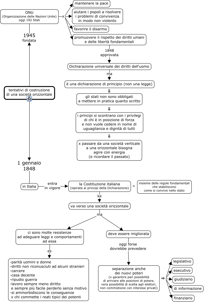 This Concept Map, created with IHMC CmapTools, has information related to: 5_tentativi_oriz, la Costituzione italiana (ispirata ai principi della Dichiarazione) ke va verso una società orizzontale, promuovere il rispetto dei diritti umani e delle libertà fondamentali 1848 approvata Dichiarazione universale dei diritti dell'uomo, ONU (Organizzazione delle Nazioni Unite) oggi 192 Stati x favorire il disarmo, deve essere migliorata oggi forse dovrebbe prevedere separazione anche dei nuovi poteri (x garantire pari possibilità di arrivare alle posizioni di potere, vera possibilità di scelta agli elettori, non commistione con interessi privati), separazione anche dei nuovi poteri (x garantire pari possibilità di arrivare alle posizioni di potere, vera possibilità di scelta agli elettori, non commistione con interessi privati) ⇒ legislativo, va verso una società orizzontale ma deve essere migliorata, separazione anche dei nuovi poteri (x garantire pari possibilità di arrivare alle posizioni di potere, vera possibilità di scelta agli elettori, non commistione con interessi privati) ⇒ esecutivo, Dichiarazione universale dei diritti dell'uomo ma è una dichiarazione di principio (non una legge), tentativi di costruzione di una società orizzontale 1945 fondata ONU (Organizzazione delle Nazioni Unite) oggi 192 Stati, ONU (Organizzazione delle Nazioni Unite) oggi 192 Stati x promuovere il rispetto dei diritti umani e delle libertà fondamentali, ONU (Organizzazione delle Nazioni Unite) oggi 192 Stati x aiutare i popoli a risolvere i problemi di convivenza in modo non violento, ci sono molte resistenze ad adeguare leggi e comportamenti ad essa es -parità uomini e donne -diritti non riconusciuti ad alcuni stranieri -carcere -casa decente -ripudio guerra -lavoro sempre meno diritto e sempre più facile perderlo senza motivo -si ammorbidiscono le conseguenze x chi commette i reati tipici dei potenti, gli stati non sono obbligati a mettere in pratica quanto scritto ⇓ i principi si scontrano con i privilegi di chi è in posizione di forza e non vuole cedere in nome di uguaglianza e dignità di tutti, in Italia entra in vigore la Costituzione italiana (ispirata ai principi della Dichiarazione), separazione anche dei nuovi poteri (x garantire pari possibilità di arrivare alle posizioni di potere, vera possibilità di scelta agli elettori, non commistione con interessi privati) ⇒ di informazione, separazione anche dei nuovi poteri (x garantire pari possibilità di arrivare alle posizioni di potere, vera possibilità di scelta agli elettori, non commistione con interessi privati) ⇒ finanziario, va verso una società orizzontale ma ci sono molte resistenze ad adeguare leggi e comportamenti ad essa, separazione anche dei nuovi poteri (x garantire pari possibilità di arrivare alle posizioni di potere, vera possibilità di scelta agli elettori, non commistione con interessi privati) ⇒ giudiziario, ONU (Organizzazione delle Nazioni Unite) oggi 192 Stati x mantenere la pace, è una dichiarazione di principio (non una legge) ⇓ gli stati non sono obbligati a mettere in pratica quanto scritto