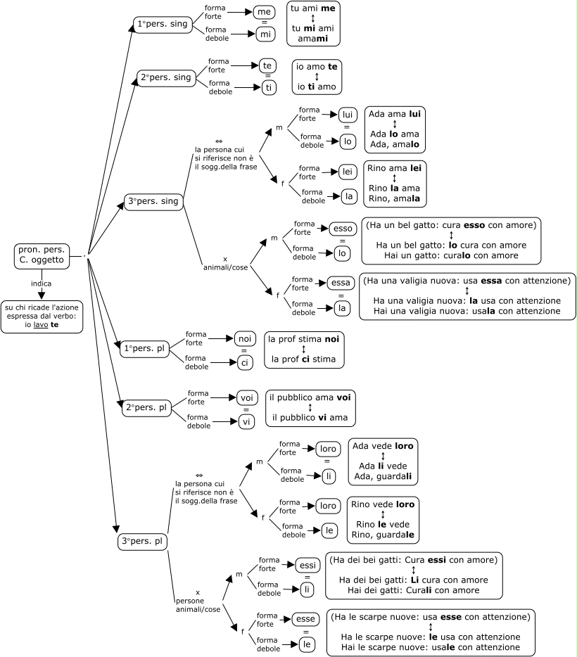 This Concept Map, created with IHMC CmapTools, has information related to: personale_oggetto, pron. pers. C. oggetto . 2°pers. sing, f forma forte esse, f forma debole la, f forma debole le, m forma debole li, 3°pers. pl ⇔ la persona cui si riferisce non è il sogg.della frase m, 2°pers. pl forma forte voi, pron. pers. C. oggetto indica su chi ricade l'azione espressa dal verbo: io lavo te, 1°pers. pl forma debole ci, pron. pers. C. oggetto . 1°pers. sing, f forma debole la, m forma debole lo, pron. pers. C. oggetto . 2°pers. pl, 2°pers. sing forma debole ti, f forma forte loro, 3°pers. pl ⇔ la persona cui si riferisce non è il sogg.della frase f, 3°pers. sing ⇔ la persona cui si riferisce non è il sogg.della frase f, 3°pers. pl x persone animali/cose m, m forma forte essi, m forma debole li