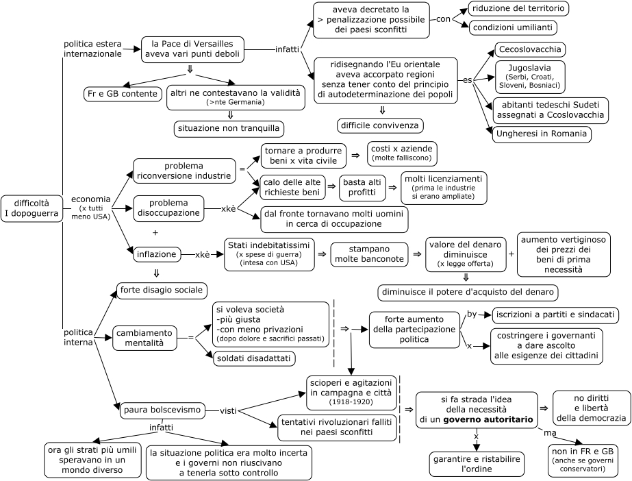This Concept Map, created with IHMC CmapTools, has information related to: 08_primo_dopoguerra, la Pace di Versailles aveva vari punti deboli ⇓ Fr e GB contente, cambiamento mentalità = si voleva società -più giusta -con meno privazioni (dopo dolore e sacrifici passati), Stati indebitatissimi (x spese di guerra) (intesa con USA) ⇒ stampano molte banconote, aveva decretato la > penalizzazione possibile dei paesi sconfitti con riduzione del territorio, ridisegnando l'Eu orientale aveva accorpato regioni senza tener conto del principio di autodeterminazione dei popoli es Cecoslovacchia, inflazione ⇓ forte disagio sociale, stampano molte banconote ⇒ valore del denaro diminuisce (x legge offerta), difficoltà I dopoguerra economia (x tutti meno USA) problema riconversione industrie, forte aumento della partecipazione politica x costringere i governanti a dare ascolto alle esigenze dei cittadini, difficoltà I dopoguerra politica interna paura bolscevismo, paura bolscevismo infatti ora gli strati più umili speravano in un mondo diverso, ridisegnando l'Eu orientale aveva accorpato regioni senza tener conto del principio di autodeterminazione dei popoli es Jugoslavia (Serbi, Croati, Sloveni, Bosniaci), la Pace di Versailles aveva vari punti deboli infatti ridisegnando l'Eu orientale aveva accorpato regioni senza tener conto del principio di autodeterminazione dei popoli, difficoltà I dopoguerra politica interna forte disagio sociale, paura bolscevismo infatti la situazione politica era molto incerta e i governi non riuscivano a tenerla sotto controllo, ridisegnando l'Eu orientale aveva accorpato regioni senza tener conto del principio di autodeterminazione dei popoli es Ungheresi in Romania, problema riconversione industrie = calo delle alte richieste beni, forte aumento della partecipazione politica by iscrizioni a partiti e sindacati, inflazione ⇓ diminuisce il potere d'acquisto del denaro, | | | | | | | ⇒ si fa strada l'idea della necessità di un governo autoritario
