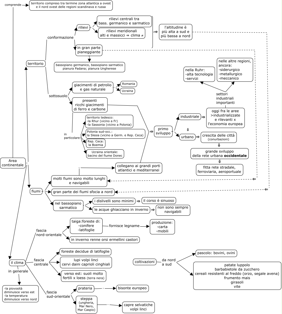 This Concept Map, created with IHMC CmapTools, has information related to: area continentale, i dislivelli sono minimi ⇒ il corso è sinuoso, steppa (ungheria, Mar Nero, Mar Caspio) . capre selvatiche volpi linci, nel bassopiano sarmatico . le acque ghiacciano in inverno, fiumi . nel bassopiano sarmatico, presenti ricchi giacimenti di ferro e carbone in particolare territorio tedesco: -la Rhur (vicino a Fr) -la Sassonia (vicino a Polonia), coltivazioni da nord a sud patate luppolo barbabietole da zucchero cereali resistenti al freddo (orzo, segale avena) frumento mais girasoli vite, primo sviluppo . industriale, molti fiumi sono molto lunghi e navigabili . collegano ai grandi porti atlantici e mediterranei, rilievi - rilievi meridionali alti e massicci ⇒ clima ≠, il clima fascia nord-orientale in inverno renne orsi ermellini castori, Area continentale - fiumi, collegano ai grandi porti atlantici e mediterranei ⇒ primo sviluppo, il clima fascia sud-orientale steppa (ungheria, Mar Nero, Mar Caspio), oggi fra le aree >industrializzate e rilevanti x l'economia europea settori industriali importanti nella Ruhr: -alta tecnologia -servizi, il clima fascia centrale foreste decidue di latifoglie, taiga:foreste di: -conifere -latifoglie fornisce legname produzione: -carta -mobili, fiumi . molti fiumi sono molto lunghi e navigabili, territorio conformazione in gran parte pianeggiante, oggi fra le aree >industrializzate e rilevanti x l'economia europea settori industriali importanti nelle altre regioni, ancora: -siderurgico -metallurgico -meccanico, presenti ricchi giacimenti di ferro e carbone in particolare Ucraina orientale: bacino del fiume Donec