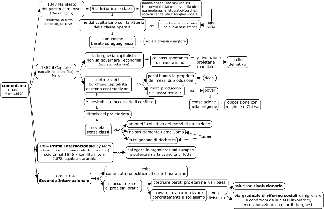 This Concept Map, created with IHMC CmapTools, has information related to: 04a_comunismo, proprietà collettiva dei mezzi di produzione ⇐ no sfruttamento uomo-uomo, comunismo (I fase: Marx-1883) . 1867 il Capitale (socialismo scientifico) Marx, comunismo (I fase: Marx-1883) . 1848 Manifesto del partito comunista (Marx+Engels), 1867 il Capitale (socialismo scientifico) Marx = nella società borghese-capitalista esistono contraddizioni, si occupò >nte di problemi pratici = trovare la via x realizzare concretamente il socialismo, società senza classi xkè proprietà collettiva dei mezzi di produzione, nella società borghese-capitalista esistono contraddizioni la> pochi hanno la proprietà dei mezzi di produzione, comunismo basato su uguaglianza ⇒ società diversa e migliore, 1889-1914 Seconda Internazionale ke ebbe come dottrina politica ufficiale il marxismo, poveri ⇓ consolazione nella religione, molti producono ricchezza per altri ma poveri, comunismo (I fase: Marx-1883) . 1889-1914 Seconda Internazionale, la borghesia capitalista non sa governare l'economia (sovrapproduzione) ⇒ collasso spontaneo del capitalismo, si occupò >nte di problemi pratici = costruire partiti proletari nei vari paesi, pochi hanno la proprietà dei mezzi di produzione ⇒ ricchi, collasso spontaneo del capitalismo ⇒by rivoluzione proletaria mondiale crollo definitivo, vittoria del proletariato ⇓ società senza classi, 1889-1914 Seconda Internazionale ke si occupò >nte di problemi pratici, 1864 Prima Internazionale by Marx (Associazione internazionale dei lavoratori) sciolta nel 1876 x conflitti interni (1872: espulsione anarchici) x collegare le organizzazioni europee e potenziarne la capacità di lotta, società senza classi xkè tutti godono di ricchezza