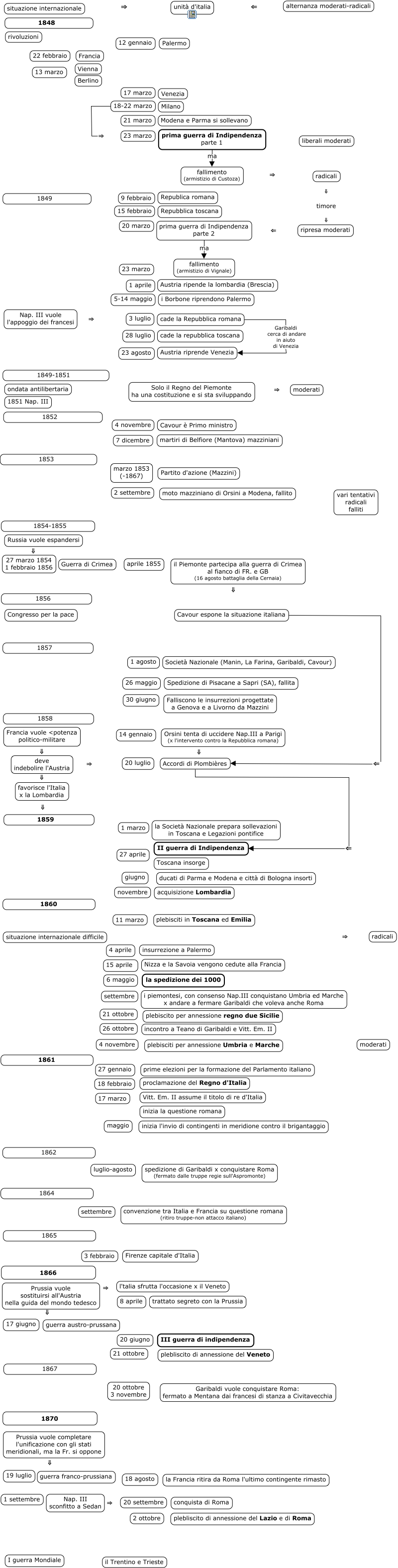 This Concept Map, created with IHMC CmapTools, has information related to: unita_italia, ripresa moderati ⇐ prima guerra di Indipendenza parte 2, 18-22 marzo ⇒ 23 marzo, Nap. III sconfitto a Sedan ⇒ 20 settembre, prima guerra di Indipendenza parte 2 ma fallimento (armistizio di Vignale), prima guerra di Indipendenza parte 1 ma fallimento (armistizio di Custoza), Russia vuole espandersi ⇓ 27 marzo 1854 1 febbraio 1856, situazione internazionale ⇒ unità d'italia, cade la Repubblica romana Garibaldi cerca di andare in aiuto di Venezia Austria riprende Venezia, Prussia vuole sostituirsi all'Austria nella guida del mondo tedesco ⇒ l'talia sfrutta l'occasione x il Veneto, Solo il Regno del Piemonte ha una costituzione e si sta sviluppando ⇒ moderati, deve indebolire l'Austria ⇒ 20 luglio, radicali ⇓ timore ⇓ ripresa moderati, Cavour espone la situazione italiana ⇐ Accordi di Plombières, Accordi di Plombières ⇐ II guerra di Indipendenza, situazione internazionale difficile ⇒ radicali, alternanza moderati-radicali ⇐ unità d'italia, deve indebolire l'Austria ⇓ favorisce l'Italia x la Lombardia, Prussia vuole completare l'unificazione con gli stati meridionali, ma la Fr. si oppone ⇓ guerra franco-prussiana, Francia vuole <potenza politico-militare ⇓ deve indebolire l'Austria, il Piemonte partecipa alla guerra di Crimea al fianco di FR. e GB (16 agosto battaglia della Cernaia) ⇓ Cavour espone la situazione italiana