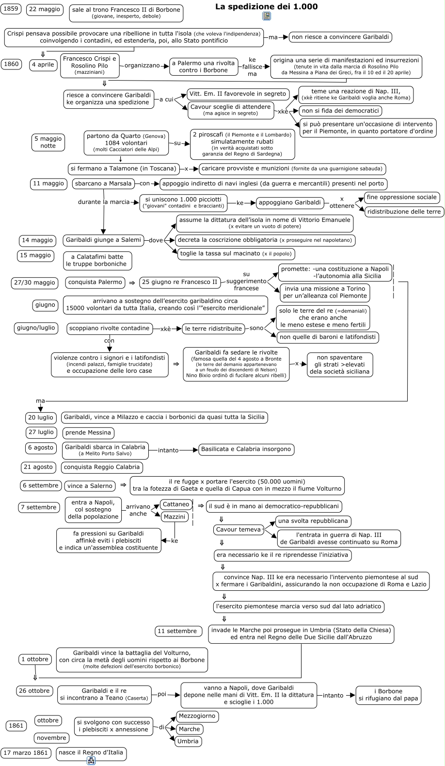 This Concept Map, created with IHMC CmapTools, has information related to: 12_spedizione_1000, vanno a Napoli, dove Garibaldi depone nelle mani di Vitt. Em. II la dittatura e scioglie i 1.000 intanto i Borbone si rifugiano dal papa, invade le Marche poi prosegue in Umbria (Stato della Chiesa) ed entra nel Regno delle Due Sicilie dall'Abruzzo ⇓ 26 ottobre, | | | | | ma 20 luglio, Cavour sceglie di attendere (ma agisce in segreto) xkè non si fida dei democratici, riesce a convincere Garibaldi ke organizza una spedizione a cui Cavour sceglie di attendere (ma agisce in segreto), convince Nap. III ke era necessario l'intervento piemontese al sud x fermare i Garibaldini, assicurando la non occupazione di Roma e Lazio ⇓ l'esercito piemontese marcia verso sud dal lato adriatico, entra a Napoli, col sostegno della popolazione arrivano anche Cattaneo, Garibaldi giunge a Salemi dove toglie la tassa sul macinato (x il popolo), Garibaldi fa sedare le rivolte (famosa quella del 4 agosto a Bronte (le terre del demanio appartenevano a un feudo dei discendenti di Nelson) Nino Bixio ordinò di fucilare alcuni ribelli) x non spaventare gli strati >elevati dela società siciliana, violenze contro i signori e i latifondisti (incendi palazzi, famiglie trucidate) e occupazione delle loro case ⇒ Garibaldi fa sedare le rivolte (famosa quella del 4 agosto a Bronte (le terre del demanio appartenevano a un feudo dei discendenti di Nelson) Nino Bixio ordinò di fucilare alcuni ribelli), conquista Palermo ⇒ 25 giugno re Francesco II, appoggiano Garibaldi x ottenere fine oppressione sociale, si uniscono 1.000 picciotti ("giovani" contadini e braccianti) ke appoggiano Garibaldi, Garibaldi giunge a Salemi dove decreta la coscrizione obbligatoria (x proseguire nel napoletano), sbarcano a Marsala durante la marcia Garibaldi giunge a Salemi, partono da Quarto (Genova) 1084 volontari (molti Cacciatori delle Alpi) ↓ si fermano a Talamone (in Toscana), riesce a convincere Garibaldi ke organizza una spedizione a cui Vitt. Em. II favorevole in segreto, l'esercito piemontese marcia verso sud dal lato adriatico ⇓ invade le Marche poi prosegue in Umbria (Stato della Chiesa) ed entra nel Regno delle Due Sicilie dall'Abruzzo, | | | | ⇒ il sud è in mano ai democratico-repubblicani, sbarcano a Marsala con appoggio indiretto di navi inglesi (da guerra e mercantili) presenti nel porto
