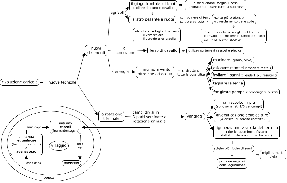 Questa Cmap, creata con IHMC CmapTools, contiene informazioni relative a: 02_rivoluzione_agricola, ferro di cavallo ⇒ utilizzo su terreni sassosi e pietrosi, il giogo frontale x i buoi (collare di legno x cavalli) ⇒ distribuendosi meglio il peso l'animale può usare tutta la sua forza, autunno cereali (frumento/segale) anno dopo maggese, vantaggi . rigenerazione >rapida del terreno (xkè le leguminose fissano dall'atmosfera azoto nel terreno), il mulino a vento oltre che ad acqua ⇒ si sfruttano tutte le possibilità frollare i panni x renderli più resistenti, rivoluzione agricola = nuove tecniche nuovi strumenti, vantaggi . un raccolto in più (sono seminati 2/3 dei campi), | | | | | ⇒ miglioramento dieta, il mulino a vento oltre che ad acqua ⇒ si sfruttano tutte le possibilità macinare (grano, olive), nuovi strumenti agricoli l'aratro pesante a ruote, vantaggi . diversificazione delle colture (⇒<rischi di perdita raccolto), nuovi strumenti agricoli il giogo frontale x i buoi (collare di legno x cavalli), primavera leguminose (fave, lenticchie...) o avena/orzo anno dopo autunno cereali (frumento/segale), la rotazione triennale campi divisi in 3 parti seminate a rotazione annuale vantaggi, nuovi strumenti x locomozione ferro di cavallo, -solco più profondo -rovesciamento delle zolle ⇓ - i semi penetrano meglio nel terreno -coltivabili anche terreni umidi e pesanti con >humus⇒>raccolto, il mulino a vento oltre che ad acqua ⇒ si sfruttano tutte le possibilità far girare pompe x prosciugare terreni, il mulino a vento oltre che ad acqua ⇒ si sfruttano tutte le possibilità tagliare la legna, rigenerazione >rapida del terreno (xkè le leguminose fissano dall'atmosfera azoto nel terreno) ⇓ spighe più ricche di semi, rivoluzione agricola = nuove tecniche la rotazione triennale