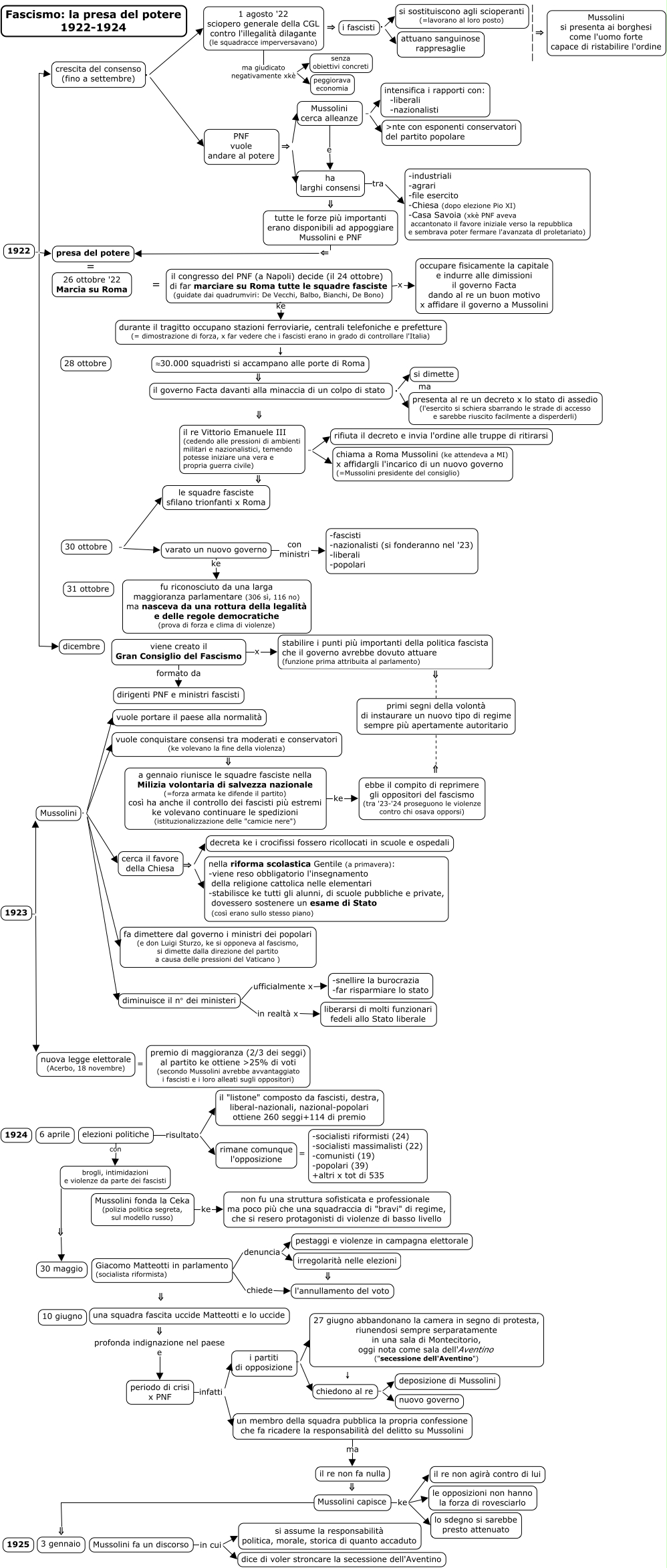This Concept Map, created with IHMC CmapTools, has information related to: 11_fascismo_2_presa potere, 1923 . nuova legge elettorale (Acerbo, 18 novembre), 1923 . Mussolini, 1922 . crescita del consenso (fino a settembre), brogli, intimidazioni e violenze da parte dei fascisti ⇓ 30 maggio, Mussolini . diminuisce il n° dei ministeri, diminuisce il n° dei ministeri in realtà x liberarsi di molti funzionari fedeli allo Stato liberale, diminuisce il n° dei ministeri ufficialmente x -snellire la burocrazia -far risparmiare lo stato, chiedono al re . nuovo governo, i partiti di opposizione . chiedono al re, Giacomo Matteotti in parlamento (socialista riformista) ⇓ una squadra fascita uccide Matteotti e lo uccide, Giacomo Matteotti in parlamento (socialista riformista) chiede l'annullamento del voto, Giacomo Matteotti in parlamento (socialista riformista) denuncia irregolarità nelle elezioni, Giacomo Matteotti in parlamento (socialista riformista) denuncia pestaggi e violenze in campagna elettorale, rimane comunque l'opposizione = -socialisti riformisti (24) -socialisti massimalisti (22) -comunisti (19) -popolari (39) +altri x tot di 535, elezioni politiche risultato rimane comunque l'opposizione, elezioni politiche con brogli, intimidazioni e violenze da parte dei fascisti, ebbe il compito di reprimere gli oppositori del fascismo (tra '23-'24 proseguono le violenze contro chi osava opporsi) ⇑ primi segni della volontà di instaurare un nuovo tipo di regime sempre più apertamente autoritario, Mussolini . fa dimettere dal governo i ministri dei popolari (e don Luigi Sturzo, ke si opponeva al fascismo, si dimette dalla direzione del partito a causa delle pressioni del Vaticano ), i fascisti . attuano sanguinose rappresaglie, PNF vuole andare al potere ⇒ Mussolini cerca alleanze