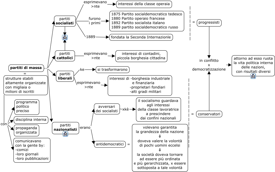 This Concept Map, created with IHMC CmapTools, has information related to: 04b_partiti_massa, partiti di massa . partiti cattolici, partiti di massa = strutture stabili altamente organizzate con migliaia o milioni di iscritti, conservatori in conflitto x democratizzazione attorno ad esso ruota la vita politica interna delle nazioni, con risultati diversi, partiti nazionalisti erano avversari dei socialisti, partiti liberali esprimevano >nte interessi di -borghesia industriale e finanziaria -proprietari fondiari -alti gradi militari, partiti liberali ke si trasformarono, partiti socialisti esprimevano >nte interessi della classe operaia, | | | | | | | | | | | | | | | | = conservatori, antidemocratici = volevano garantita la grandezza della nazione ⇓ doveva valere la volontà di pochi uomini eccelsi ⇓ la società doveva tornare ad essere più ordinata e più gerarchizzata, x essere sottoposta a tale volontà, partiti di massa . partiti liberali, partiti di massa . partiti socialisti, partiti socialisti furono i primi 1875 Partito socialdemocratico tedesco 1880 Partito operaio francese 1892 Partito socialista italano 1889 partito socialdemocratico russo, | | | | | | | | = progressisti, partiti nazionalisti erano antidemocratici, strutture stabili altamente organizzate con migliaia o milioni di iscritti con disciplina interna, partiti cattolici esprimevano >nte interessi di contadini, piccola borghesia cittadina, strutture stabili altamente organizzate con migliaia o milioni di iscritti con comunicavano con la gente by: -comizi -loro giornali -loro pubblicazioni, progressisti in conflitto x democratizzazione attorno ad esso ruota la vita politica interna delle nazioni, con risultati diversi, partiti di massa . partiti nazionalisti, partiti socialisti 1889 fondata la Seconda Internazionle