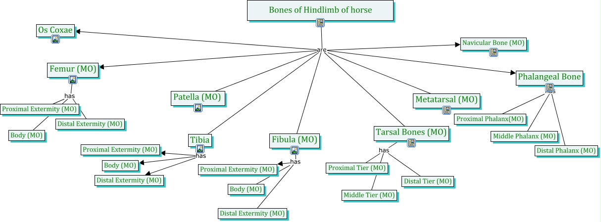 This Concept Map, created with IHMC CmapTools, has information related to: Bones of Hindlimb, Femur (MO) has Body (MO), Fibula (MO) has Body (MO), Phalangeal Bone has Proximal Phalanx(MO), Bones of Hindlimb of horse are Phalangeal Bone, Tarsal Bones (MO) has Middle Tier (MO), Tarsal Bones (MO) has Proximal Tier (MO), Tarsal Bones (MO) has Distal Tier (MO), Bones of Hindlimb of horse are Navicular Bone (MO), Bones of Hindlimb of horse are Tibia, Fibula (MO) has Distal Extermity (MO), Bones of Hindlimb of horse are Femur (MO), Bones of Hindlimb of horse are Metatarsal (MO), Bones of Hindlimb of horse are Fibula (MO), Tibia has Body (MO), Phalangeal Bone has Distal Phalanx (MO), Tibia has Distal Extermity (MO), Phalangeal Bone has Middle Phalanx (MO), Bones of Hindlimb of horse are Patella (MO), Bones of Hindlimb of horse are Tarsal Bones (MO), Fibula (MO) has Proximal Extermity (MO)