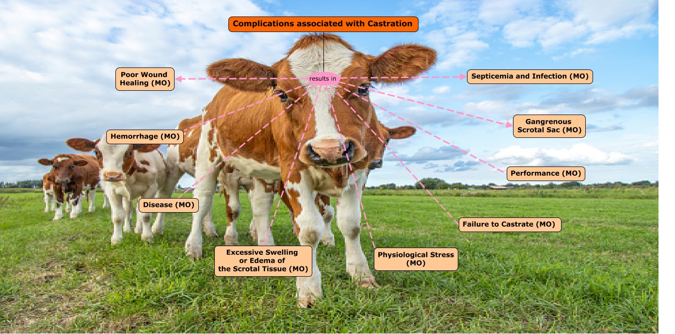This Concept Map, created with IHMC CmapTools, has information related to: Surgical Complications, Complications associated with Castration results in Septicemia and Infection (MO), Complications associated with Castration results in Hemorrhage (MO), Complications associated with Castration results in Disease (MO), Complications associated with Castration results in Excessive Swelling or Edema of the Scrotal Tissue (MO), Complications associated with Castration results in Physiological Stress (MO), Complications associated with Castration results in Gangrenous Scrotal Sac (MO), Complications associated with Castration results in Failure to Castrate (MO), Complications associated with Castration results in Poor Wound Healing (MO), Complications associated with Castration results in Performance (MO)
