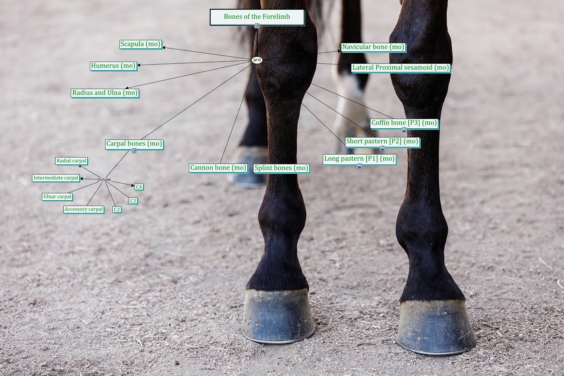 This Concept Map, created with IHMC CmapTools, has information related to: Bones of the Forelimb, Bones of the Forelimb are Coffin bone [P3] (mo), Bones of the Forelimb are Navicular bone (mo), Bones of the Forelimb are Scapula (mo), Carpal bones (mo) Include Intermediate carpal, Carpal bones (mo) Include C4, Bones of the Forelimb are Radius and Ulna (mo), Carpal bones (mo) Include C3, Bones of the Forelimb are Short pastern [P2] (mo), Bones of the Forelimb are Lateral Proximal sesamoid (mo), Bones of the Forelimb are Cannon bone (mo), Bones of the Forelimb are Splint bones (mo), Bones of the Forelimb are Humerus (mo), Carpal bones (mo) Include Ulnar carpal, Carpal bones (mo) Include Accessory carpal, Bones of the Forelimb are Long pastern [P1] (mo), Bones of the Forelimb are Carpal bones (mo), Carpal bones (mo) Include Radial carpal, Carpal bones (mo) Include C2
