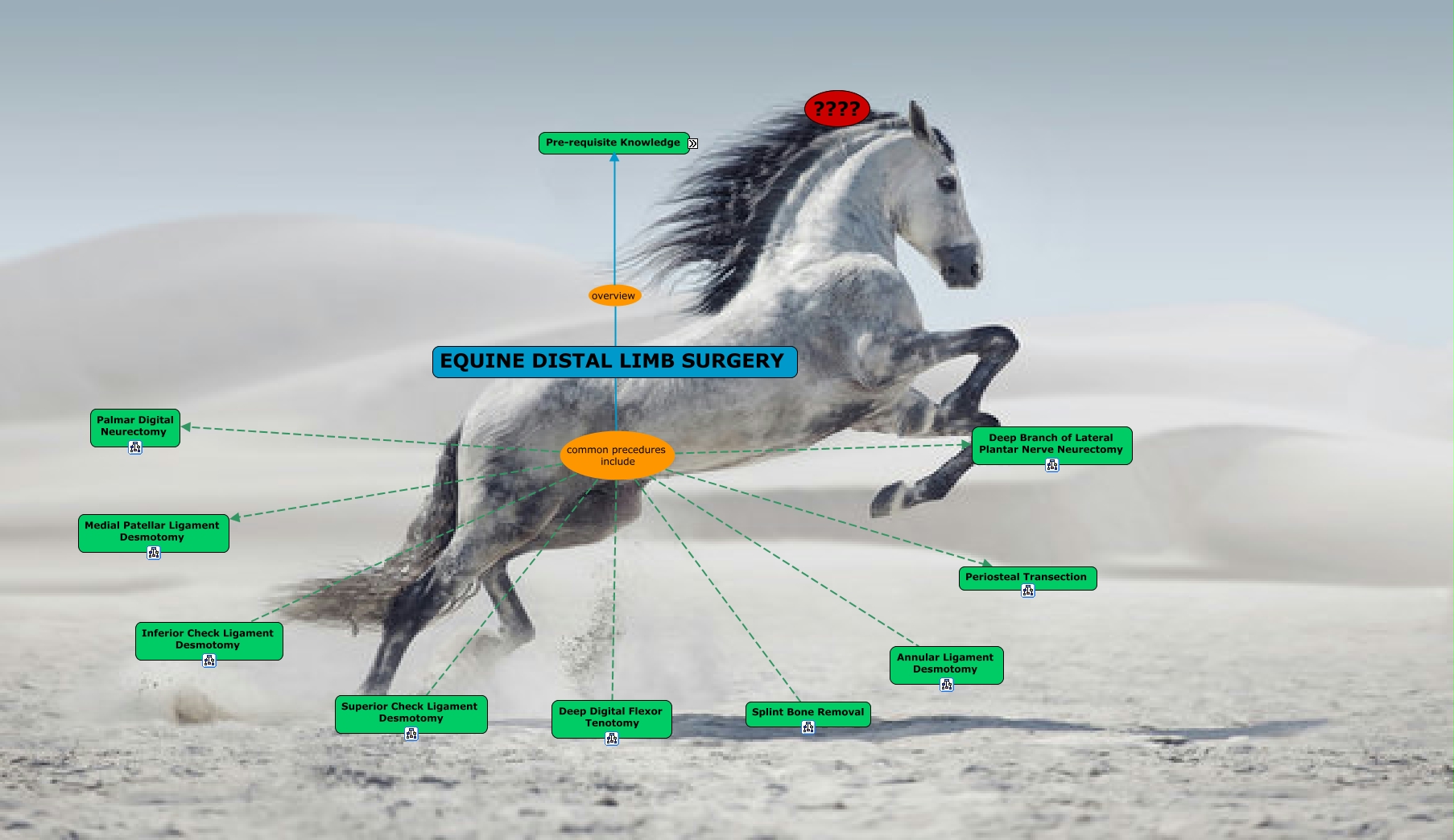 This Concept Map, created with IHMC CmapTools, has information related to: Lab 6 Equine Distal Limb Surgery, EQUINE DISTAL LIMB SURGERY common precedures include Annular Ligament Desmotomy, EQUINE DISTAL LIMB SURGERY common precedures include Deep Branch of Lateral Plantar Nerve Neurectomy, EQUINE DISTAL LIMB SURGERY overview Pre-requisite Knowledge, Pre-requisite Knowledge must know General Anatomy, Pre-requisite Knowledge must know Factors Affecting Wound Healing (MO), EQUINE DISTAL LIMB SURGERY common precedures include Periosteal Transection, Pre-requisite Knowledge must know Equine Lameness (MO), EQUINE DISTAL LIMB SURGERY common precedures include Deep Digital Flexor Tenotomy, EQUINE DISTAL LIMB SURGERY common precedures include Palmar Digital Neurectomy, EQUINE DISTAL LIMB SURGERY common precedures include Inferior Check Ligament Desmotomy, EQUINE DISTAL LIMB SURGERY common precedures include Splint Bone Removal, EQUINE DISTAL LIMB SURGERY common precedures include Medial Patellar Ligament Desmotomy, EQUINE DISTAL LIMB SURGERY common precedures include Superior Check Ligament Desmotomy