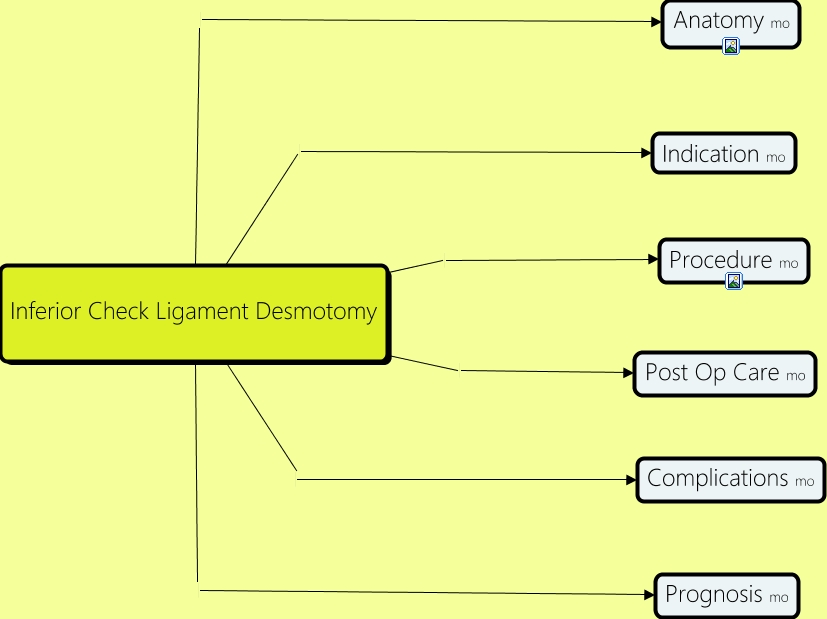This Concept Map, created with IHMC CmapTools, has information related to: Inf. Check Lig. Desmotomy, Inferior Check Ligament Desmotomy Post Op Care mo, Inferior Check Ligament Desmotomy Indication mo, Inferior Check Ligament Desmotomy Complications mo, Inferior Check Ligament Desmotomy Anatomy mo, Inferior Check Ligament Desmotomy Procedure mo, Inferior Check Ligament Desmotomy Prognosis mo