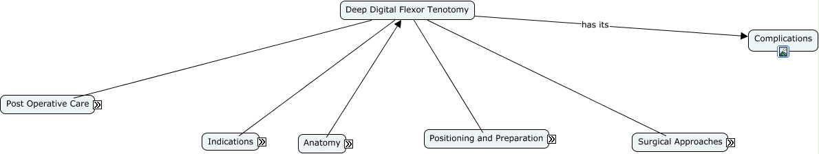 This Concept Map, created with IHMC CmapTools, has information related to: DDFT Tenotomy, Deep Digital Flexor Tenotomy has two approaches Distal Approach, Post Operative Care includes Bandages (MO), Deep Digital Flexor Tenotomy has two approaches Mid Metacarpal Approach (MO), Deep Digital Flexor Tenotomy is indicated by Lamnitis with Severe Distal Phalangeal Malilignment, Deep Digital Flexor Tenotomy 's success is also dependent upon Post Operative Care, Post Operative Care includes Medications (MO), Deep Digital Flexor Tenotomy has its Complications, Deep Digital Flexor Tenotomy is indicated by Stage II Flexural Deformities, Deep Digital Flexor Tenotomy involves proper Positioning and Preparation (MO), Knowledge of the Anatomy (MO) is an important prerequisite to performing Deep Digital Flexor Tenotomy, Post Operative Care includes Excercise Restrictions (MO), Post Operative Care includes Suture Removal, Deep Digital Flexor Tenotomy is indicated by Hoof Ground Angle degrees, Clipping and Swabbing is important in keeping asepsis during Positioning and Preparation (MO)