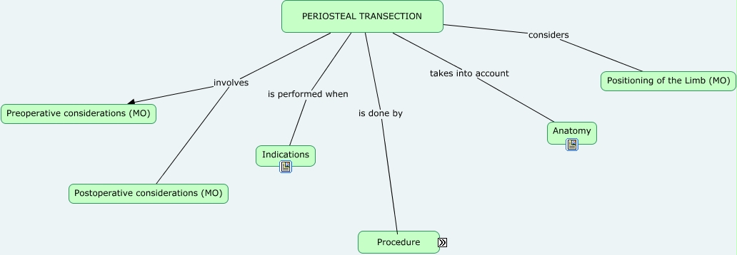 This Concept Map, created with IHMC CmapTools, has information related to: Periosteal Transection, PERIOSTEAL TRANSECTION considers Positioning of the Limb (MO), Procedure using Equipment (MO), PERIOSTEAL TRANSECTION takes into account Anatomy, PERIOSTEAL TRANSECTION involves Postoperative considerations (MO), PERIOSTEAL TRANSECTION is done by Procedure, PERIOSTEAL TRANSECTION involves Preoperative considerations (MO), Procedure ???? Expected Outcome (MO), PERIOSTEAL TRANSECTION is performed when Indications, Procedure can arise Complications (MO)
