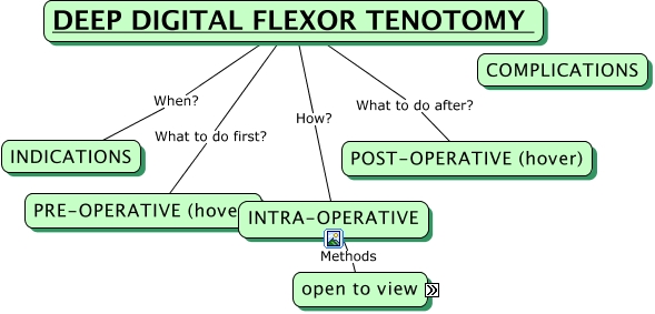 This Concept Map, created with IHMC CmapTools, has information related to: Deep Digital Flexor Tenotomy, DEEP DIGITAL FLEXOR TENOTOMY When? INDICATIONS, DEEP DIGITAL FLEXOR TENOTOMY What to do first? PRE-OPERATIVE (hover), INTRA-OPERATIVE Methods open to view, DEEP DIGITAL FLEXOR TENOTOMY How? INTRA-OPERATIVE, DEEP DIGITAL FLEXOR TENOTOMY What to do after? POST-OPERATIVE (hover)