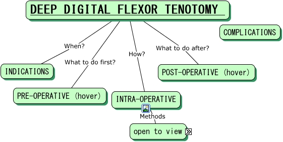 This Concept Map, created with IHMC CmapTools, has information related to: Untitled, INTRA-OPERATIVE Methods open to view, DEEP DIGITAL FLEXOR TENOTOMY What to do after? POST-OPERATIVE (hover), DEEP DIGITAL FLEXOR TENOTOMY What to do first? PRE-OPERATIVE (hover), DEEP DIGITAL FLEXOR TENOTOMY When? INDICATIONS, DEEP DIGITAL FLEXOR TENOTOMY How? INTRA-OPERATIVE