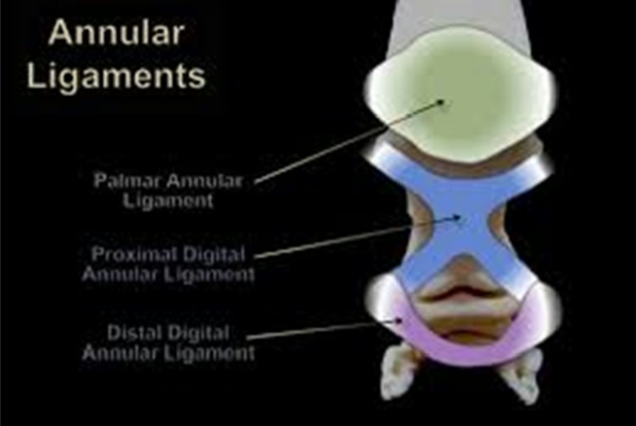 This Concept Map, created with IHMC CmapTools, has information related to: Palmer Annular Ligament 5, Palmer Annular Ligament Desmotomy (MO) Surgical Procedures Tenoscopic Approach: 1) A 2-cm skin incision is made that is centered between the proximal border of the PAL and the ergot on the palmar– plantar midline. 2) An arthroscope is inserted into the incision site entering distal to the annular ligament. 3) After which a cannula is then guided through the sheath from proximal to distal under arthroscopic control to ensure that it does not lie inside the manica flexoria. 4) The central obturator is then removed and a hook knife is introduced to incise the palmar annular ligament via the slot in the cannula. 5) This can be introduced from either a proximal or a distal direction, with the arthroscope in the opposite end to view the procedure. **This technique allows closed and accurate transection of the ligament without damaging other structures. **This method allows visual inspection of the entire sheath cavity and division of the annular ligament., Palmer Annular Ligament Desmotomy (MO) Pre-operative Consideration Instruments required (MO), Palmer Annular Ligament Desmotomy (MO) overview Anatomy, Palmer Annular Ligament Desmotomy (MO) Post-Operative Consideration Bandaging (MO), Palmer Annular Ligament Desmotomy (MO) Post-Operative Consideration Prognosis (MO), Palmer Annular Ligament Desmotomy (MO) overview Advantages and Disadvantages (MO), Palmer Annular Ligament Desmotomy (MO) Pre-operative Consideration Anesthesia & Preparation (MO), Palmer Annular Ligament Desmotomy (MO) overview Complications (MO), Palmer Annular Ligament Desmotomy (MO) Post-Operative Consideration Exercise (MO), Palmer Annular Ligament Desmotomy (MO) Post-Operative Consideration Suture Removal (MO), Palmer Annular Ligament Desmotomy (MO) Surgical Procedures Blind Surgical Approach: 1) After surgical preparations, a 2-cm skin incision is made that is centered between the proximal border of the PAL and the ergot on the palmar– plantar midline. 2) Sharp dissection is continued through the subcutaneous tissue down to the transverse fibers of the PAL using a #15 blade. 3) Carefully dissect through the PAL until the division between the PAL and longitudinal fibers of the SDF tendon is identified through a 5-mm incision. 4) Curved Kelly forceps are directed through the incision in the PAL and tunneled under the distal half of the annular ligament to verify the dissection plane and serve as a guide for transection. 5) Kelly forceps are opened several millimeters, and a #15 blade is inserted between the jaws of the forceps with the cutting edge toward the annular ligament and advanced to incise the ligament. 6) The forceps may have to be repositioned once more further distally to complete the distal transection. 7)The forceps are then redirected proximally, and the proximal half is transected in the same manner to complete the PAL release. 8) In most cases, the attachment of the flexor sheath on either side of the midline can be seen in the surgical field. 9)By placing a finger into the skin incision and palpating the incised PAL, one can verify the complete release of the PAL. 10)The subcutaneous tissue is closed in a continuous pattern by using absorbable suture material, and the skin is closed by using nonabsorbable suture material in an interrupted pattern., Palmer Annular Ligament Desmotomy (MO) overview Indications (MO)