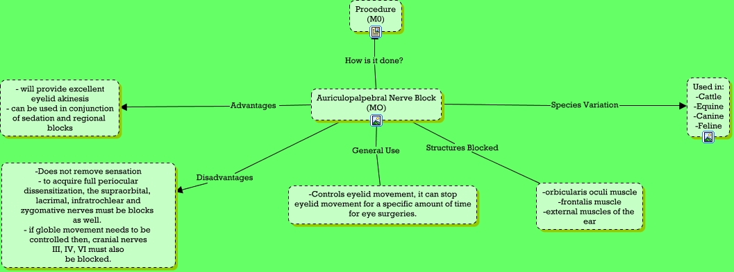 This Concept Map, created with IHMC CmapTools, has information related to: Auriculopalpebral Nerve Block, Auriculopalpebral Nerve Block (MO) Species Variation Used in: -Cattle -Equine -Canine -Feline, Auriculopalpebral Nerve Block (MO) Advantages - will provide excellent eyelid akinesis - can be used in conjunction of sedation and regional blocks, Auriculopalpebral Nerve Block (MO) Disadvantages -Does not remove sensation - to acquire full periocular dissensitization, the supraorbital, lacrimal, infratrochlear and zygomative nerves must be blocks as well. - if globle movement needs to be controlled then, cranial nerves III, IV, VI must also be blocked., Auriculopalpebral Nerve Block (MO) Structures Blocked -orbicularis oculi muscle -frontalis muscle -external muscles of the ear, Auriculopalpebral Nerve Block (MO) General Use -Controls eyelid movement, it can stop eyelid movement for a specific amount of time for eye surgeries., Auriculopalpebral Nerve Block (MO) How is it done? Procedure (M0)