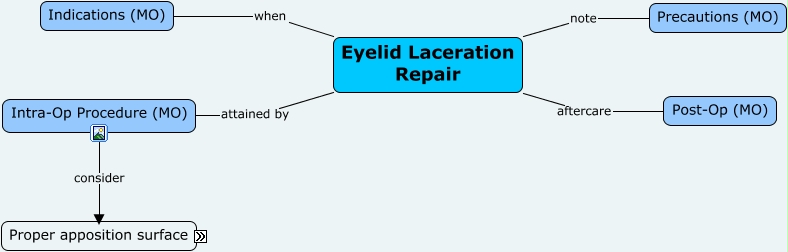 This Concept Map, created with IHMC CmapTools, has information related to: Eyelid Laceration Repair 2, Proper apposition surface (MO) attained by Triangular-shaped V-Plasty (MO), Eyelid Laceration Repair when Indications (MO), Eyelid Laceration Repair attained by Intra-Op Procedure (MO), Proper apposition surface (MO) attained by Pentagonal-shaped V-Plasty (MO), Intra-Op Procedure (MO) consider Proper apposition surface (MO), Eyelid Laceration Repair aftercare Post-Op (MO), Eyelid Laceration Repair note Precautions (MO)