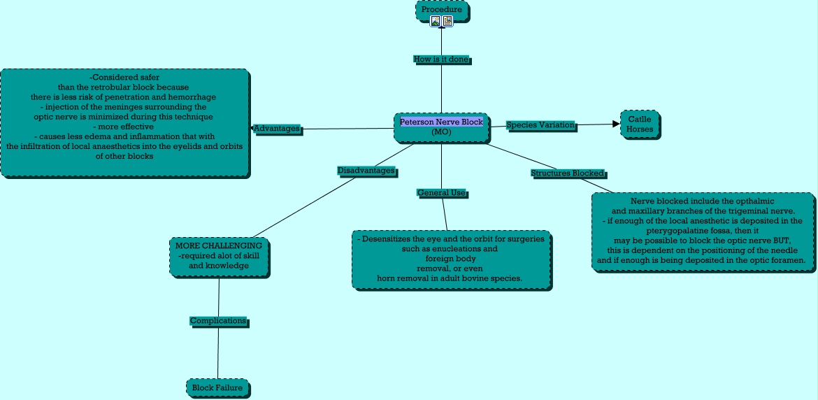 This Concept Map, created with IHMC CmapTools, has information related to: Peterson NerveBlock, Peterson Nerve Block (MO) Disadvantages MORE CHALLENGING -required alot of skill and knowledge, Peterson Nerve Block (MO) How is it done Procedure, Peterson Nerve Block (MO) Species Variation Catlle Horses, Peterson Nerve Block (MO) Advantages -Considered safer than the retrobular block because there is less risk of penetration and hemorrhage - injection of the meninges surrounding the optic nerve is minimized during this technique - more effective - causes less edema and inflammation that with the infiltration of local anaesthetics into the eyelids and orbits of other blocks, Peterson Nerve Block (MO) Structures Blocked Nerve blocked include the opthalmic and maxillary branches of the trigeminal nerve. - if enough of the local anesthetic is deposited in the pterygopalatine fossa, then it may be possible to block the optic nerve BUT, this is dependent on the positioning of the needle and if enough is being deposited in the optic foramen., MORE CHALLENGING -required alot of skill and knowledge Complications Block Failure, Peterson Nerve Block (MO) General Use - Desensitizes the eye and the orbit for surgeries such as enucleations and foreign body removal, or even horn removal in adult bovine species.