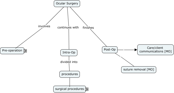 This Concept Map, created with IHMC CmapTools, has information related to: Eye Surgery Main ( do not edit ), procedures also includes Eye removal, procedures involves Ectropion, Pre-op continues with Client communications [MO], procedures including Eyelid tacking, Ocular Surgery finishes Post-Op, Ocular Surgery continues with Intra-Op, Pre-op restraint of animal and physical exam, Post-Op suture removal [MO], procedures comprises of Subconjunctivial injection, Ocular Surgery involves Pre-op, Pre-op History and sigalment, Pre-op collection of Drugs[MO], procedures including Third eyelid removal, Pre-op followed by Gathering of Tools [MO], Post-Op Care/client communications [MO], procedures includes Entropion treatment, procedures composed of Eyelid laceration repair, Intra-Op divided into procedures, Pre-op initiates with Knowledge of Anatomy