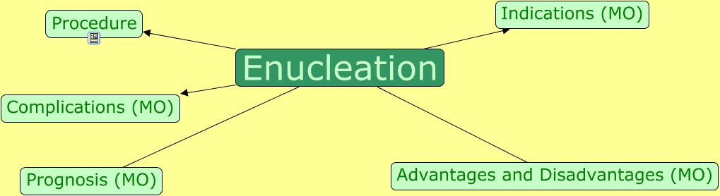 This Concept Map, created with IHMC CmapTools, has information related to: Enucleation, Enucleation Advantages and Disadvantages (MO), Enucleation Complications (MO), Enucleation Prognosis (MO), Enucleation Procedure, Enucleation Indications (MO)