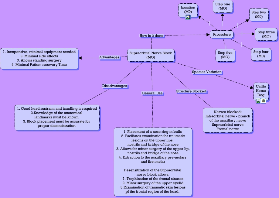 This Concept Map, created with IHMC CmapTools, has information related to: Infraorbital or Supraorbital Nerve Block, Procedure Location (M0), Supraorbital Nerve Block (MO) Structure Blocked Nerves blocked: Infraorbital nerve - branch of the maxillary nerve Supraorbital nerve Frontal nerve, Procedure Step two (M0), Procedure Step three (MO), Supraorbital Nerve Block (MO) Disadvantages 1. Good head restraint and handling is required 2.Knowledge of the anatomical landmarks must be known. 3. Block placement must be accurate for proper desensitization., Procedure Step four (M0), Supraorbital Nerve Block (MO) Species Variation Cattle Horse Dog, Supraorbital Nerve Block (MO) Advantages 1. Inexpensive, minimal equipment needed 2. Minimal side effects 3. Allows standing surgery 4. Minimal Patient recovery Time, Supraorbital Nerve Block (MO) How is it done Procedure, Procedure Step five (MO), Procedure Step one (MO), Supraorbital Nerve Block (MO) General Use 1. Placement of a nose ring in bulls 2. Faciliates examination for traumatic lesions on the upper lips, nostrils and bridge of the nose 3. Allows for minor surgery of the upper lip, nostrils and bridge of the nose 4. Extraction fo the maxillary pre-molars and first molar Desensitization of the Supraorbital nerve block allows: 1. Trephination of the frontal sinuses 2. Minor surgery of the upper eyelid 3.Examination of traumatic skin lesions pf the frontal region of the head.