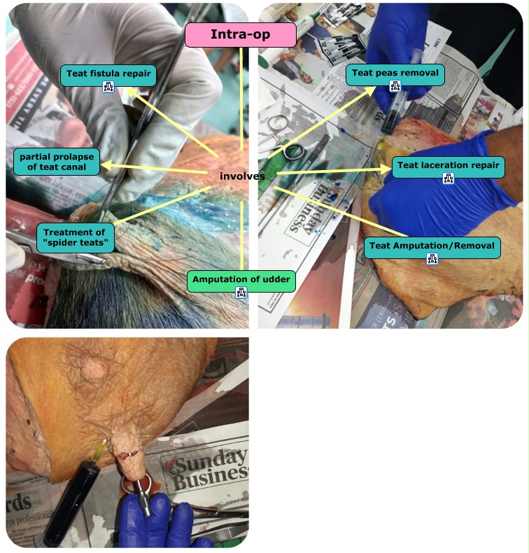 This Concept Map, created with IHMC CmapTools, has information related to: Intra-operation, Intra-op involves Amputation of udder, Intra-op involves Treatment of "spider teats", Intra-op involves Teat fistula repair, Intra-op involves Teat Amputation/Removal, Intra-op involves Teat peas removal, Intra-op involves partial prolapse of teat canal, Intra-op involves Teat laceration repair