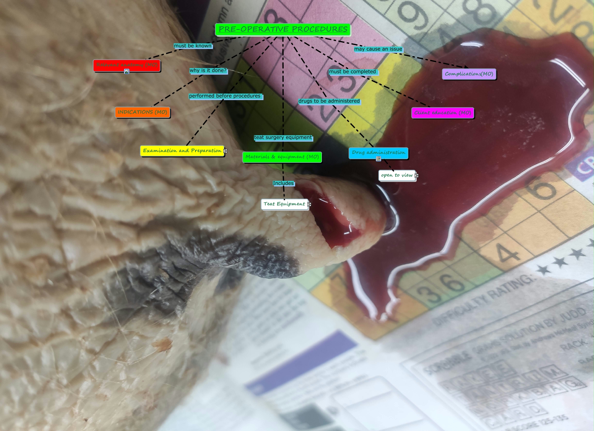This Concept Map, created with IHMC CmapTools, has information related to: Pre op, Intramammary infusions includes Mastop-H, PRE-OPERATIVE PROCEDURES must be completed Client education (MO), Distance + Physical exam (MO) also includes Restraint and Pre-surgical Preparation (MO), Teat Equipment Includes Udder Infusion Cannulas (MO), Drug administration also includes the use of Anaesthetic blocks, Teat Equipment Includes Hugg's Tumor Remover (MO), Teat Equipment Includes Doyen Clamp (MO), Intramammary infusions includes Drycloxakel, PRE-OPERATIVE PROCEDURES teat surgery equipment Materials & equipment (MO), Materials & equipment (MO) Includes Teat Equipment, PRE-OPERATIVE PROCEDURES may cause an issue Complications(MO), Teat Equipment Includes Teat tumor extractor(MO), PRE-OPERATIVE PROCEDURES drugs to be administered Drug administration, PRE-OPERATIVE PROCEDURES must be known Relevant anatomy (MO), PRE-OPERATIVE PROCEDURES why is it done? INDICATIONS (MO), Drug administration also includes the use of Intramammary infusions, Teat Equipment Includes Teat Slitter (MO), Intramammary infusions includes Mastikel, PRE-OPERATIVE PROCEDURES performed before procedures Distance + Physical exam (MO)