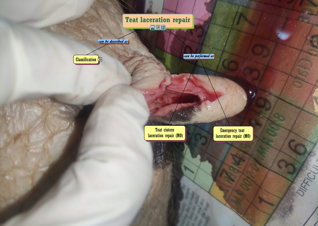 This Concept Map, created with IHMC CmapTools, has information related to: intra op, Teat laceration repair can be performed as Emergency teat laceration repair (MO), Teat laceration repair can be performed as Teat cistern laceration repair (MO), Teat laceration repair can be described as Classification